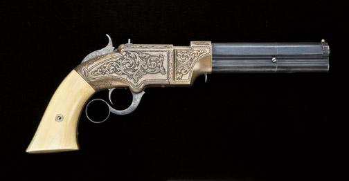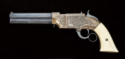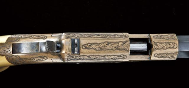 Volcanic .41 caliber lever-action large frame repeating pistol, blue with traces of silver finish, ivory grips, serial #912. The barrel shows “Volcanic Repeating Arms Co. Pat. New Haven 1854” on barrel. Approx. 75-85% original blue that is drifting slightly at the edges with just beginning light erosion and normal wear. The pin at the front of the magazine tube is missing. The magazine follower is an old hand-made replacement. The frame is beautifully and deluxe engraved with floral scrolls and roses with checkerboard background, similar to Henry rifles. The pistol is fitted with fine original ivory grips that show some minor yellowing, slight age cracks, normal aging, but are very good plus overall and definitely original to this pistol. The small parts show bright original blue including sight and bolt. The hammer and lever show considerable mottled case hardening within their patina, at least 30%. The frame is sharp and completely uncleaned. There has been a repair to the firing pin and forward portion of the bolt. The bore is near excellent. A beautiful large-frame Volcanic with crisp edges and an absolutely beautiful frame. Est: $50,000-80,000.