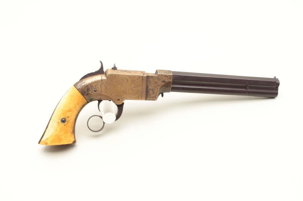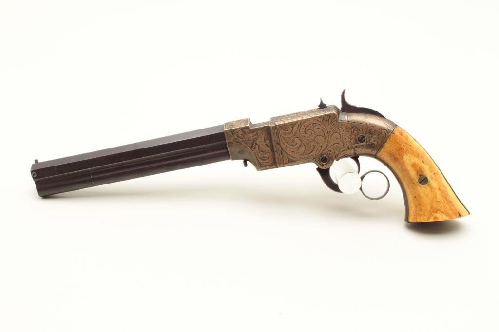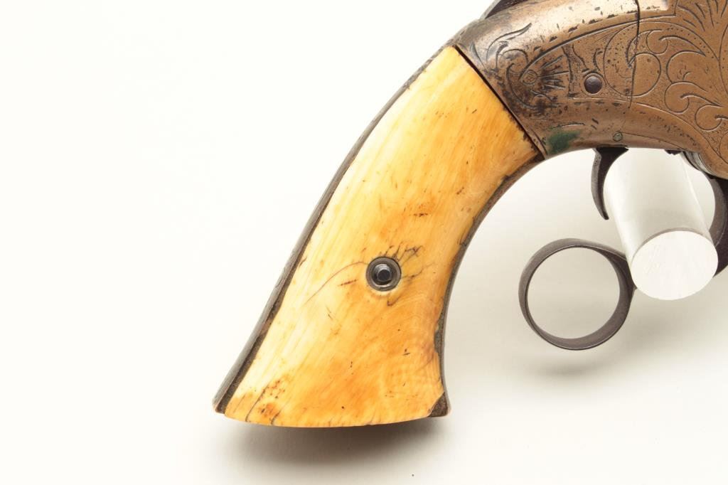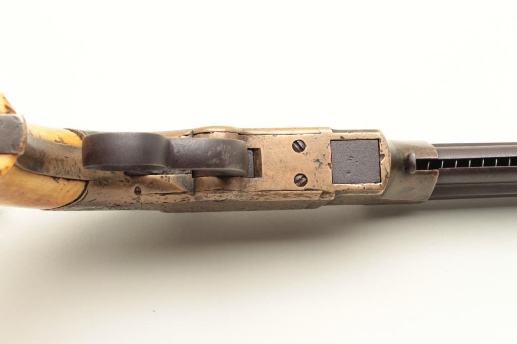 motif with original to the period mellow and patina ivory grips, S/N 1719 with clear Volcanic Arms Co. New Haven address and visible patent markings. The barrel shows considerable original blue finish mixed with nice brown patina. The frame remains dark and honey colored with darkened original silver gone to blue-black. The grips underneath show S/N 1719 also with some minor imperfection and losses. The grips show dirt underneath and don’t look like they were ever removed in the last 100 years. The magazine thumb piece is a period replacement as is rear sight. The overall condition is good to very good with great uncleaned and “Out of the attic” appearance. Provenance: John Miller collection. Our consignor obtained this volcanic in the 1960’s from Miller who owned Monte Vista Hotel in downtown Palm Springs, CA. Miller had obtained this Volcanic from an early California pioneer family and it was a family heirloom. Miller was an iconic early California collector mentioned in Madis’s