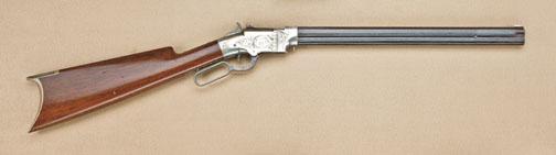 Volcanic carbine, 16-1/2” barrlel, .41 caliber, in  fine to near excellent original condition,  showing one-line New Have address, patent February  14, 1854. One of less than one thousand long arms  produced, refer Flayderman 5K-019. The barrels show approx. 75-85% original blue drifting to  brown with some scattered light erosion and  pinprick pitting, staining, normal aging just  starting. Very sharp edges, completely uncleaned.  Good clear address. The frame shows 70-80% original thick silver plate that is uncleaned and  shows patina where brass is exposed. The buttplate  shows 40-50% darkened original silver plate, also  uncleaned. The varnished wood stock is very good  plus to near fine with 90% plus original varni some minor storage scratches and marks, with  impeccable wood to metal fit. The original disk  elevating rear sight is retained. The sight, small  parts, and screws, show bright original blue with  most of the fire blue on the lifter. The hammer and lever show considerable original color. The  action is good, interior very good. A completely  uncleaned and untouched volcanic carbine that  would be hard to improve upon and very expensive.  Est: $45,000-90,000