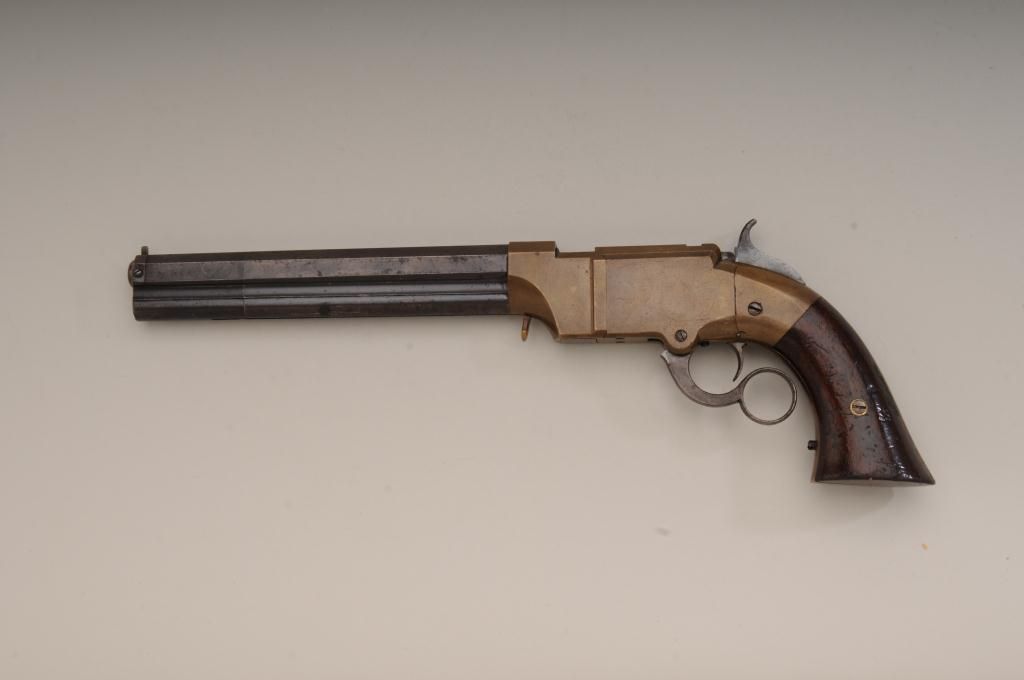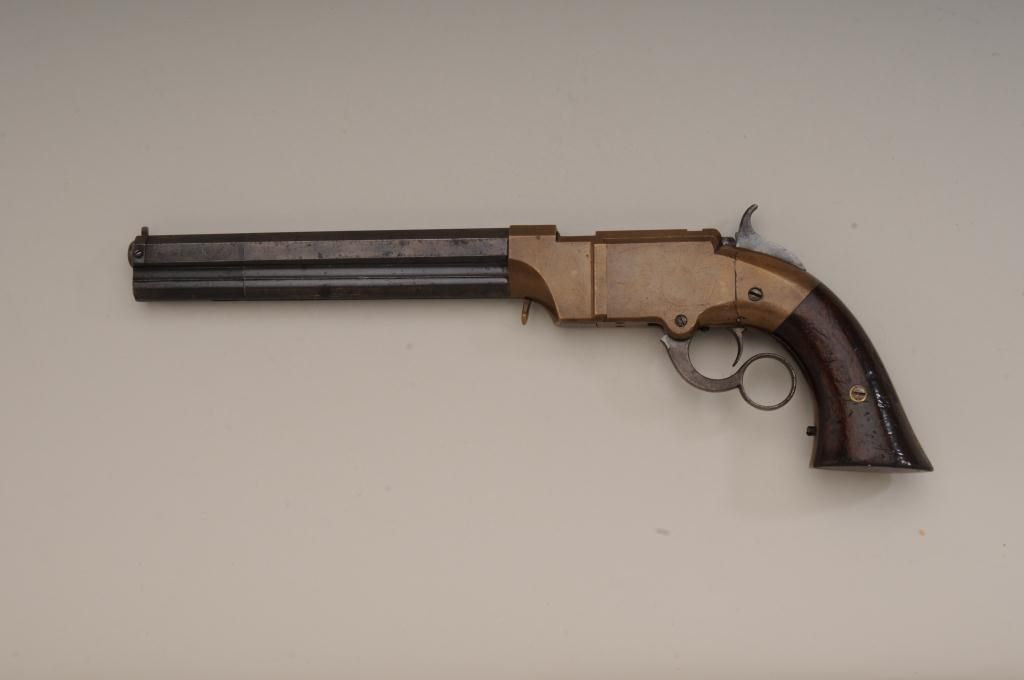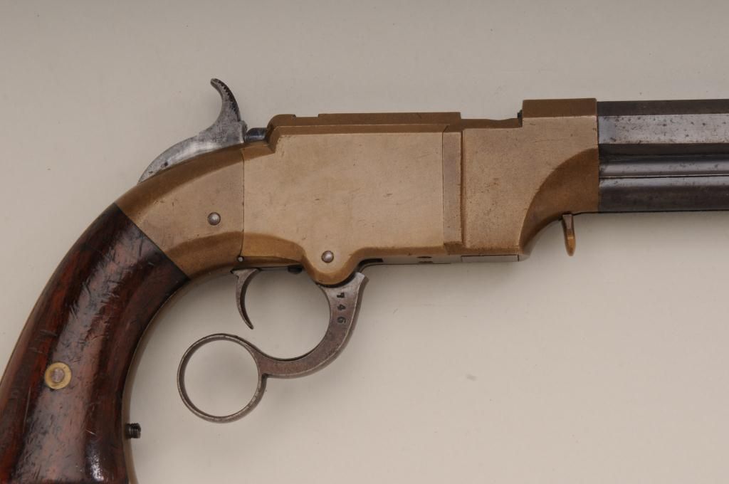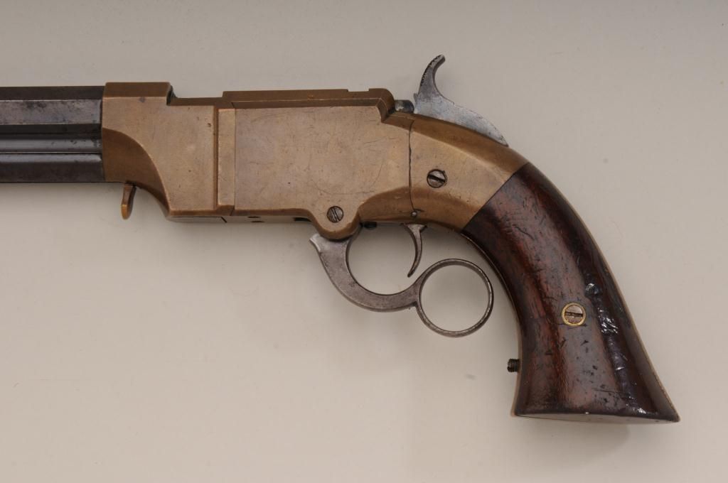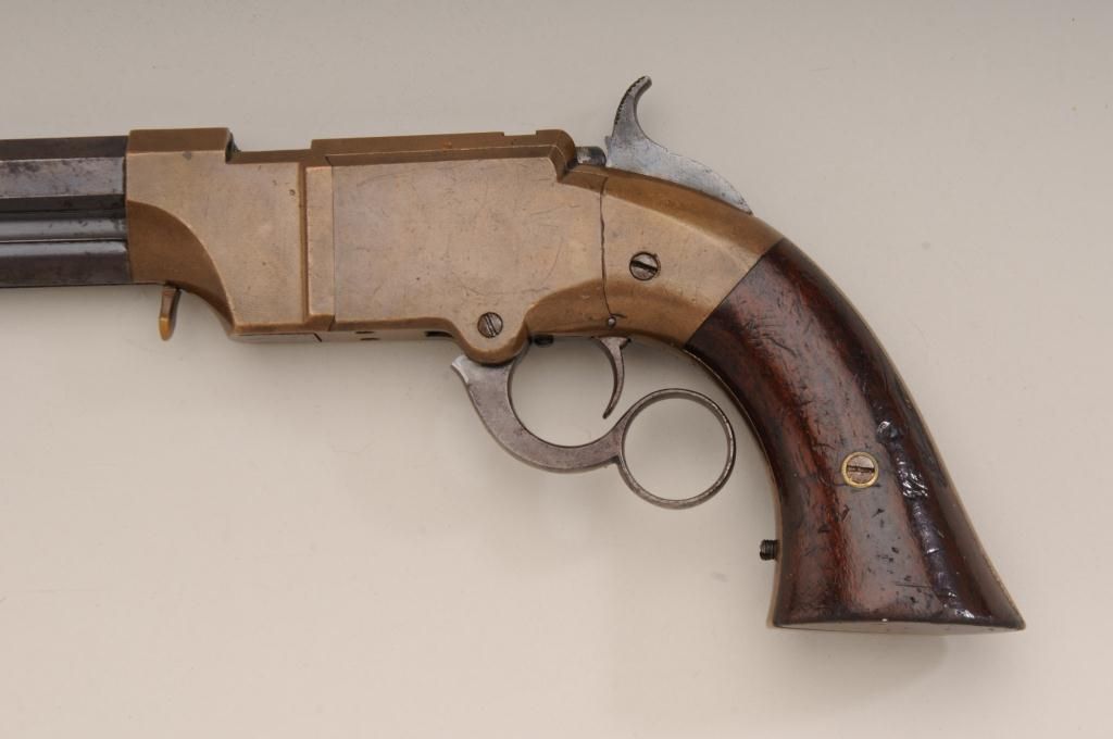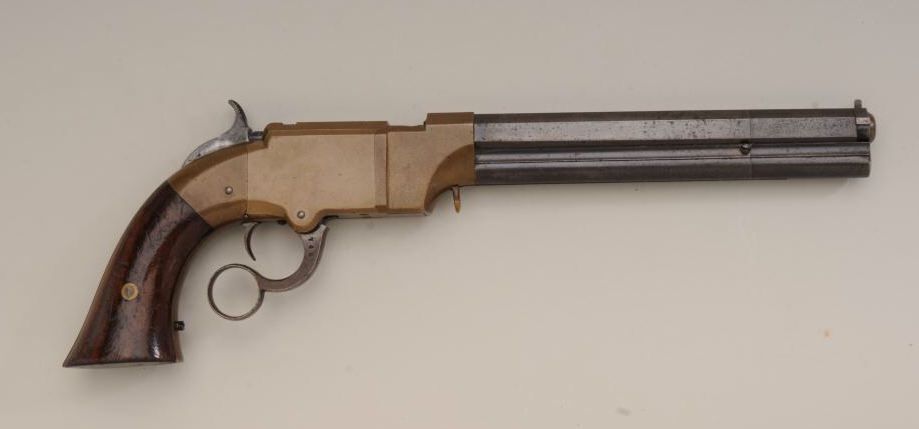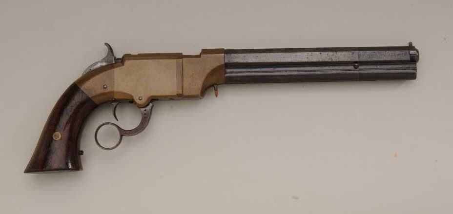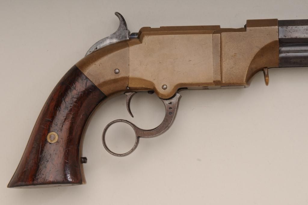 Volcanic lever action Navy pistol remaining in original very good to near fine condition with 8” barrel in .41 caliber, blue finish, varnished wood grips, serial number 746. The barrel address reads “The Volcanic RepeatingArms Company, patent, New Haven Conn., February 14, 1854. The barrel retains 75% to 85% original blue going slightly brown with some scattered light to moderate erosion and pinprick pitting just starting and some ofwhich may clean. The edges are very sharp and the barrel address is well defined. There is some very bright blue mixed in the barrel finish. The frame is a deep honey color and completely uncleaned in modern times. Theframe shows just a couple of minor scratches and normal aging. The hammer and lever show traces of case hardening within their patina. The bolt and firing pin show traces of finish. The varnished wood grips are verygood with approximately 75% to 85% varnish and many small scratches and marks which are all minor. The action works well and the bore is near excellent and still remains bright and shiny. The front sight and loading lever