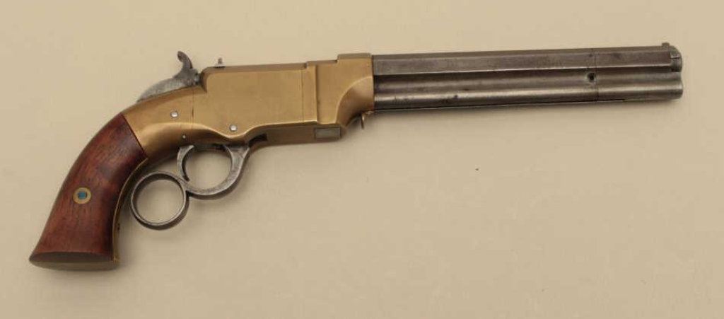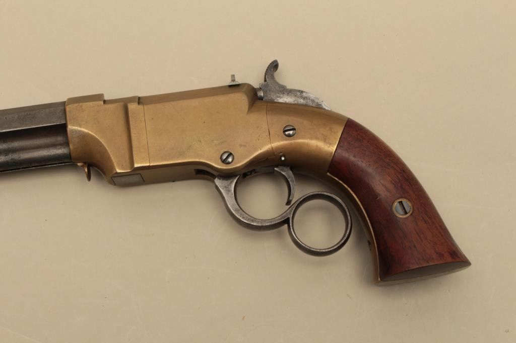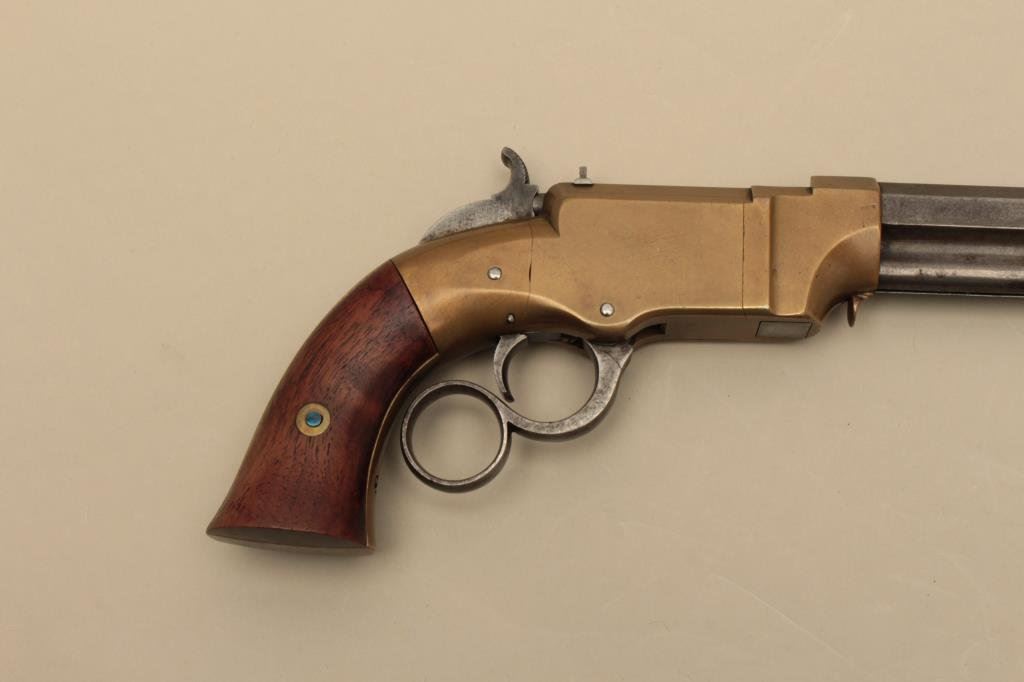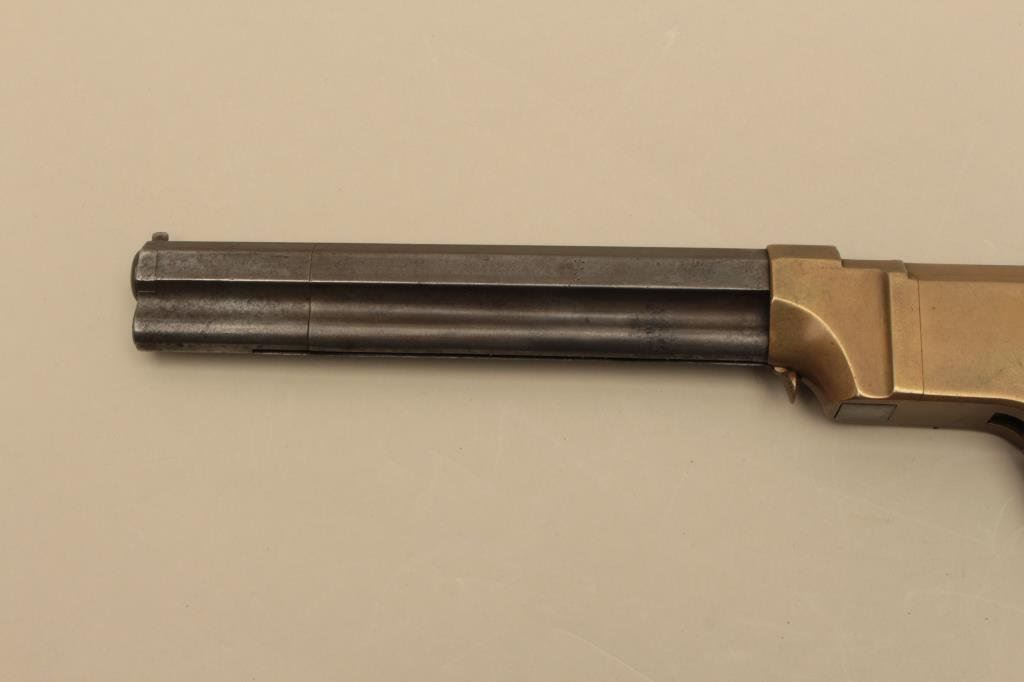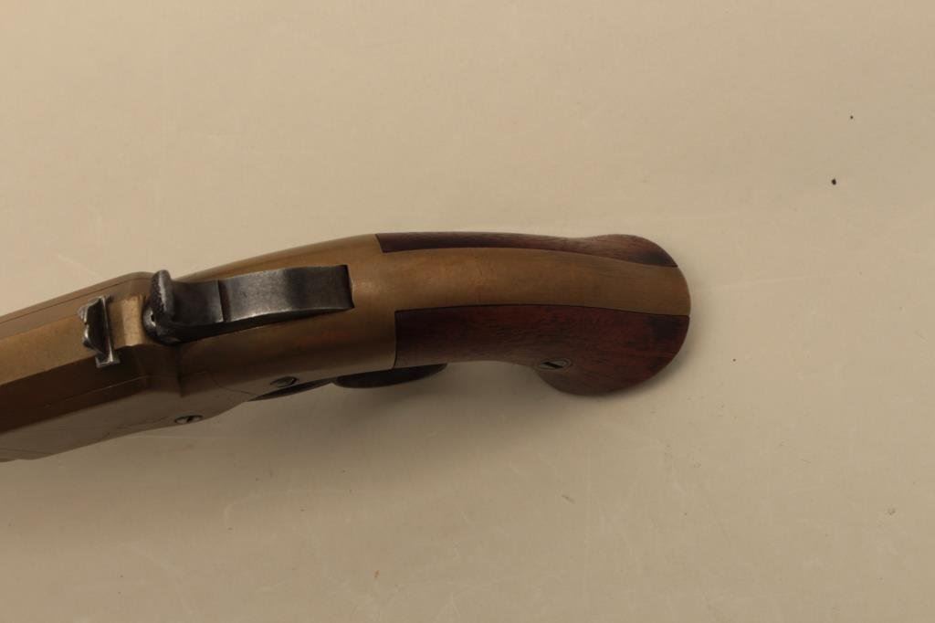 brass frame, expertly made replacement wood grips, in overall very good condition with a beautiful taffy colored patina to brass frame and grey patina to barrel assembly; grips are finely made replacements; good action. (Antique). Est.: $4,000-$8,000.