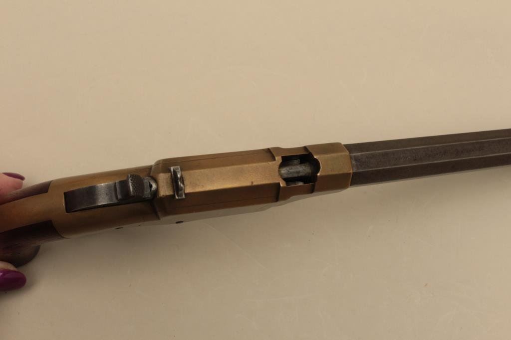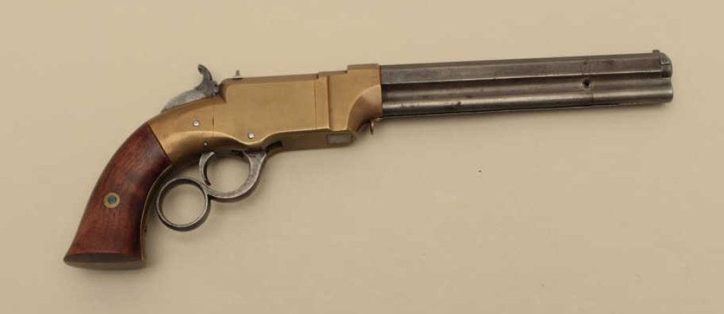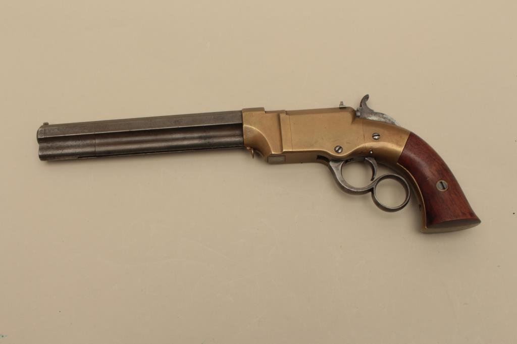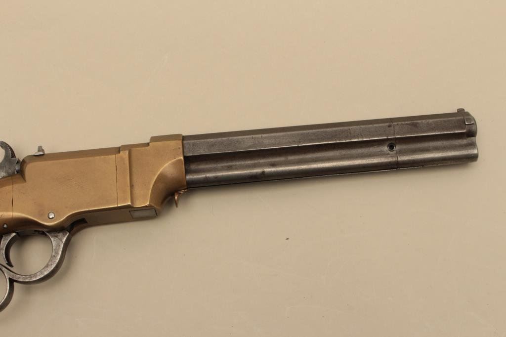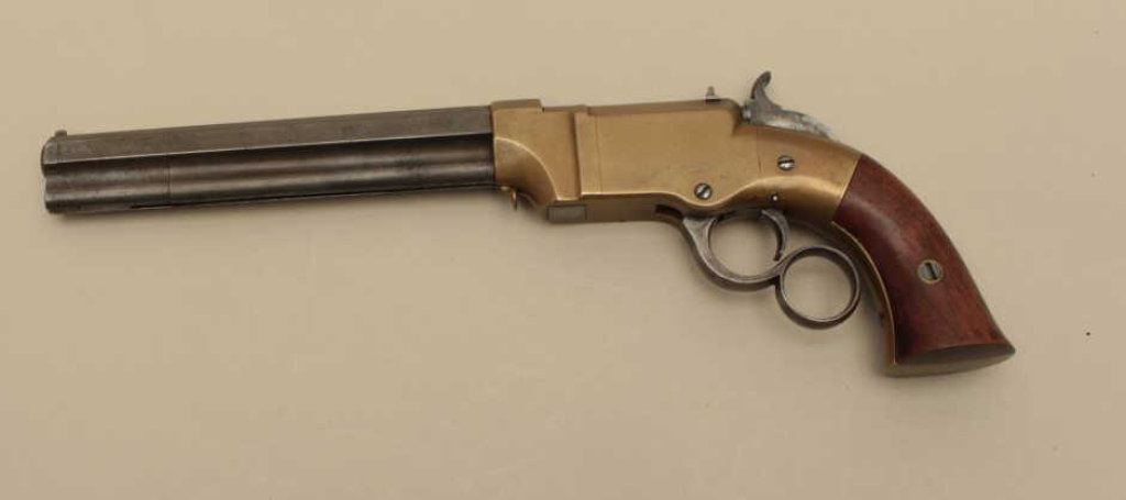 brass frame, expertly made replacement wood grips, in overall very good condition with a beautiful taffy colored patina to brass frame and grey patina to barrel assembly; grips are finely made replacements; good action. (Antique). Est.: $4,000-$8,000.