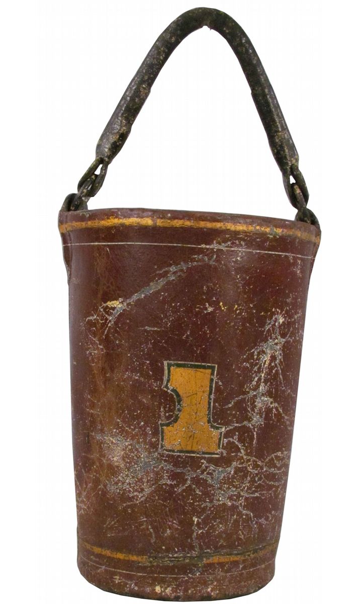Volcanized Rubber Fire Bucket, ca. 1860. Handle intact. Hand Painted #1. Some paint flaking otherwise good condition. 12 1/2 inches tall.