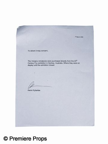 Premiere Props nor the consignor makes any warranties, expressed or implied, as to merchantability or fitness for a particular purpose, the correctness of the catalogue or other description of the physical condition, size, quality, rarity, importance, medium, provenance, exhibitions, literature, historical relevance of any property, intended use, condition of the property (including any condition report), correctness of description, origin, measurement, quality, rarity, importance, exhibition, relevance, attribution, source, provenance, date, authorship, condition, culture, genuineness, value, or period of the property. Additionally, neither Premiere Props nor the consigner makes any representation or warranty, expressed or implied, as to whether the Bidder acquires any copyrights, including but not limited to any reproduction rights of any property, or other intellectual property (including exhibition or reproduction rights) or whether the property is subject to any limitations such as ‘droit morale’ (moral rights) or other rights affecting works of art. Premiere Props does not make any representation or warranty as to title.