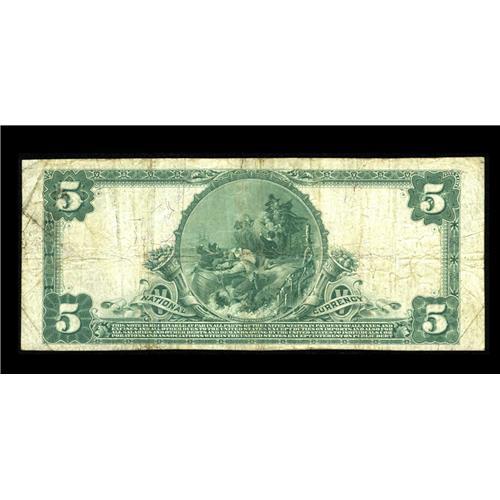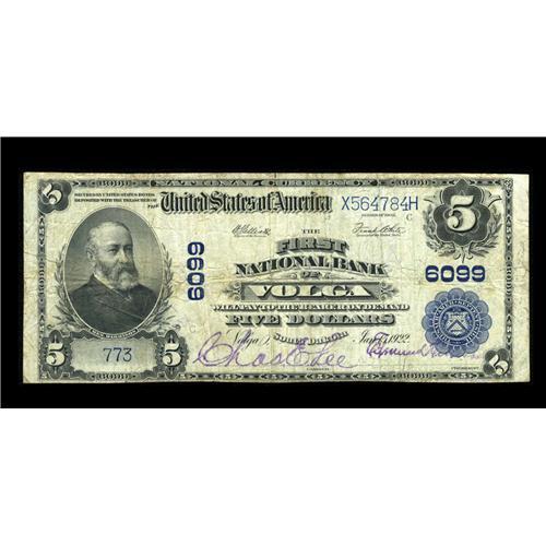 <B>Volga, SD</B></I> - $5 1902 Plain Back Fr. 608 <B>The First NB</B></I> Ch. # 6099<BR>This is a very rare note from a one bank community in the proverbial one horse town. While we would like to enliven our description of this item with a learned dissertation concerning the early homesteaders here who came from Russia, and, homesick for the motherland, named the community after their beloved river, the reality is that there were no Russians, the town name has nothing to do with the Volga River (it was named after an even more obscure community of the same name in neighboring Iowa), and the place was originally called Bandy Town after its original settler. The census shows just three large notes, including this piece, with a large outstanding of a ridiculously low $490 in 1935. If this were any other state but South Dakota, we would be estimating this attractive <B>Fine+</B></I> example for four or five thousand dollars, but because they pay us the big dollars to come up with real world estimates, our best guess here is...<BR><BR><b>Shipping:</b> Coin/Currency (<a target="_blank" href="http://www.heritageauctions.com/common/shipping.php">view shipping information</a>)