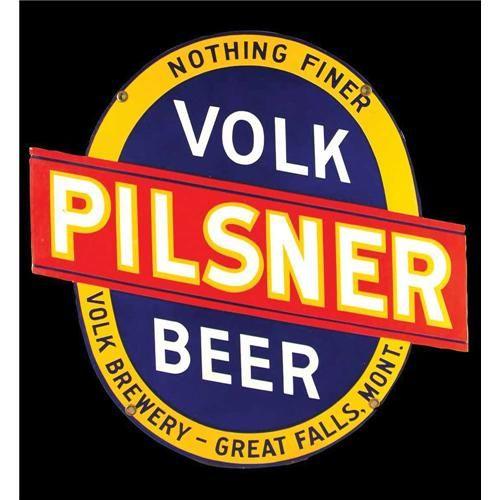 Volk Pilsner Beer, Great Falls, MT. Porcelain Sign, two sided. Both sides near mint. 40 X 36 inches.