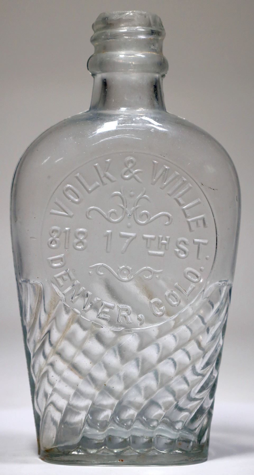 Not in Preble. Volk & Wille / 818 17th St. / Denver, Colo. Wavy raised pattern on bottom third of bottle. Clear glass, shoo fly, 6", ground top. No information located about these merchants on CHNC or newspapers.com