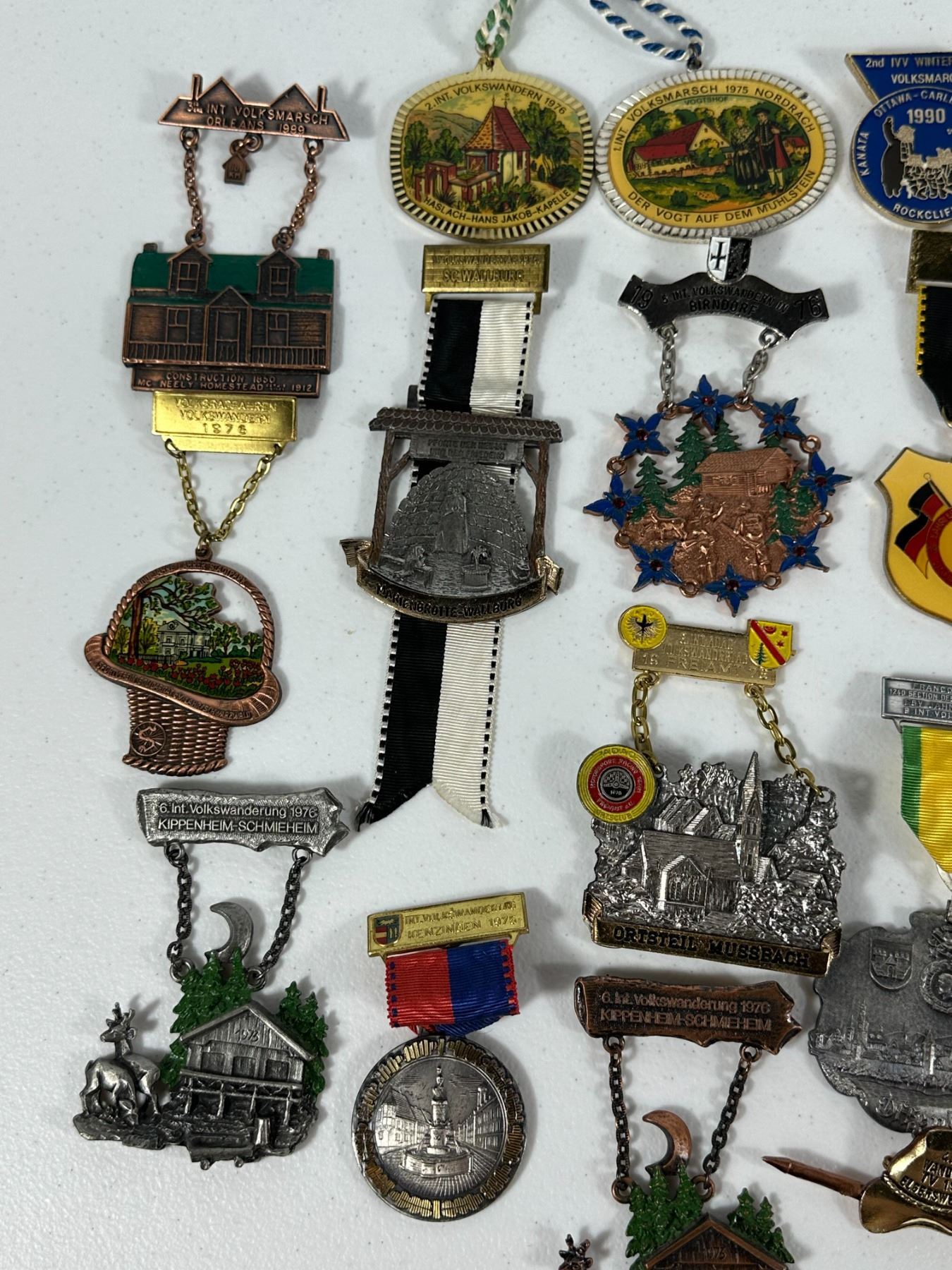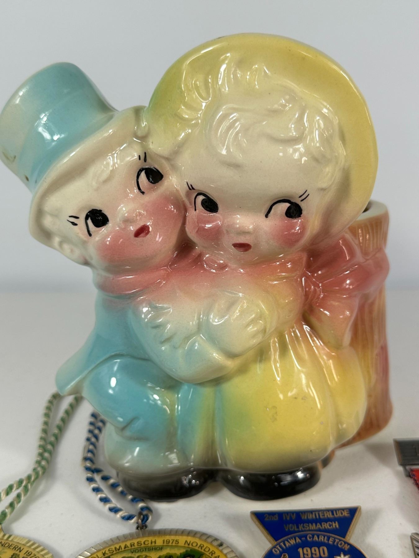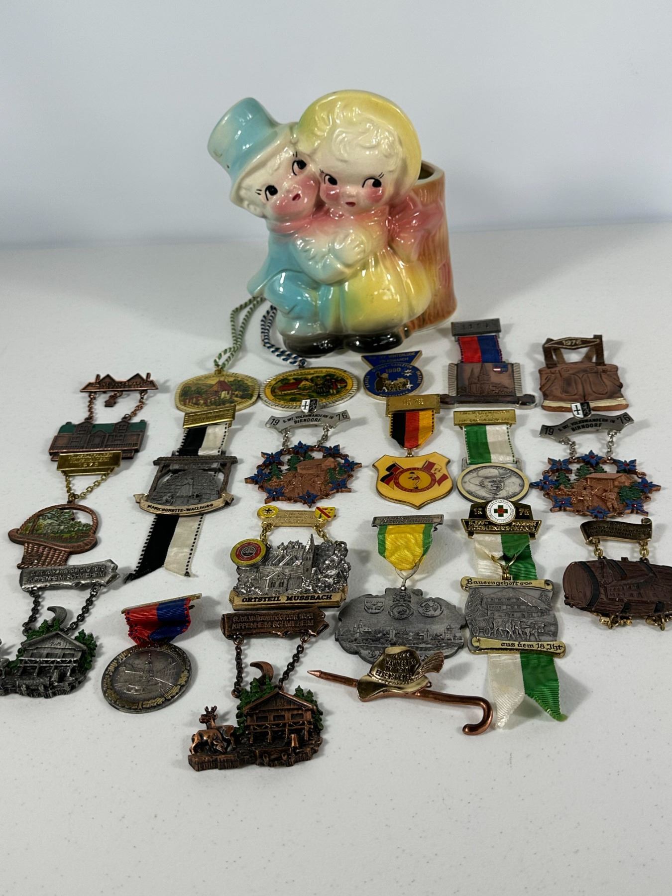 Includes assorted German souvenir and Volksmarch medals, pins, and ribbons (1970s–1990s) with a ceramic planter of boy and girl hugging.
