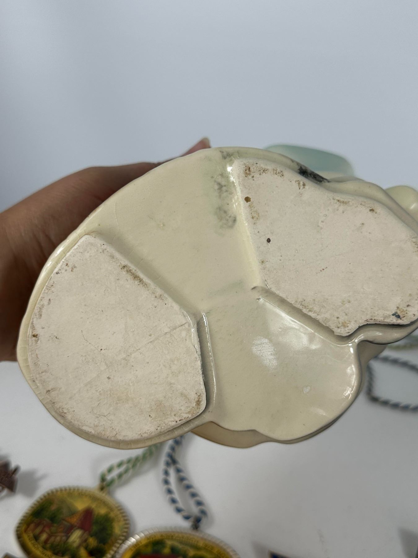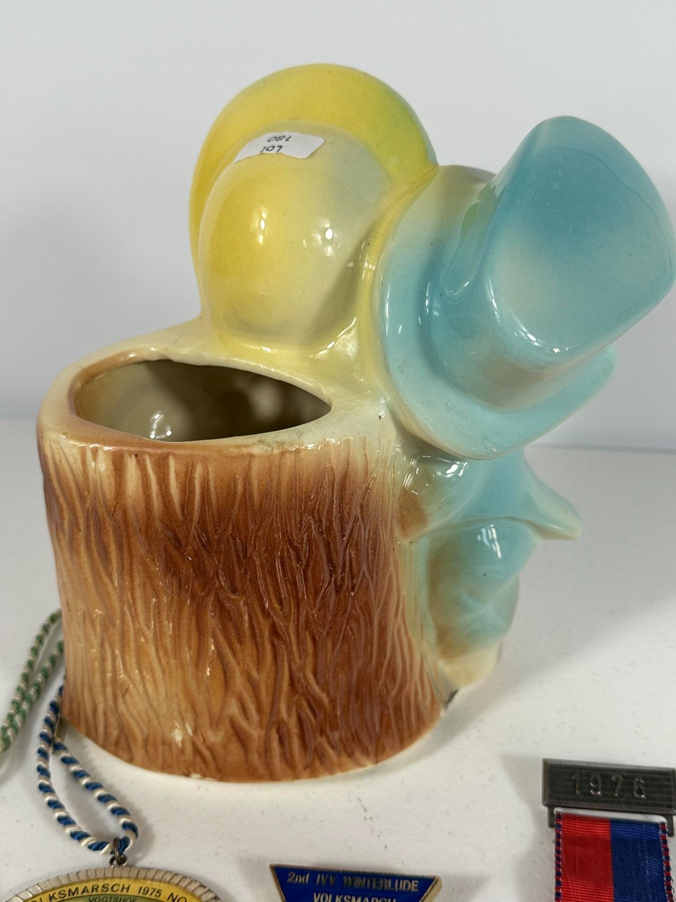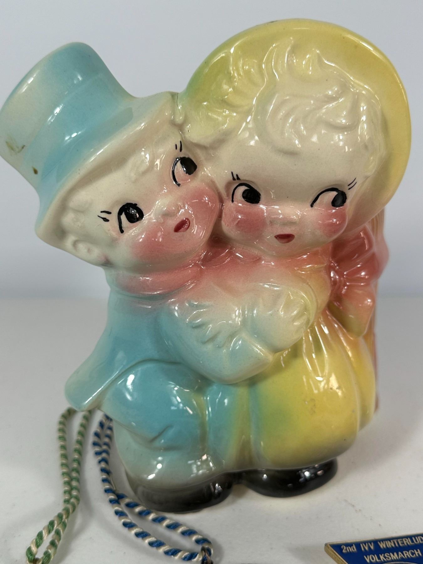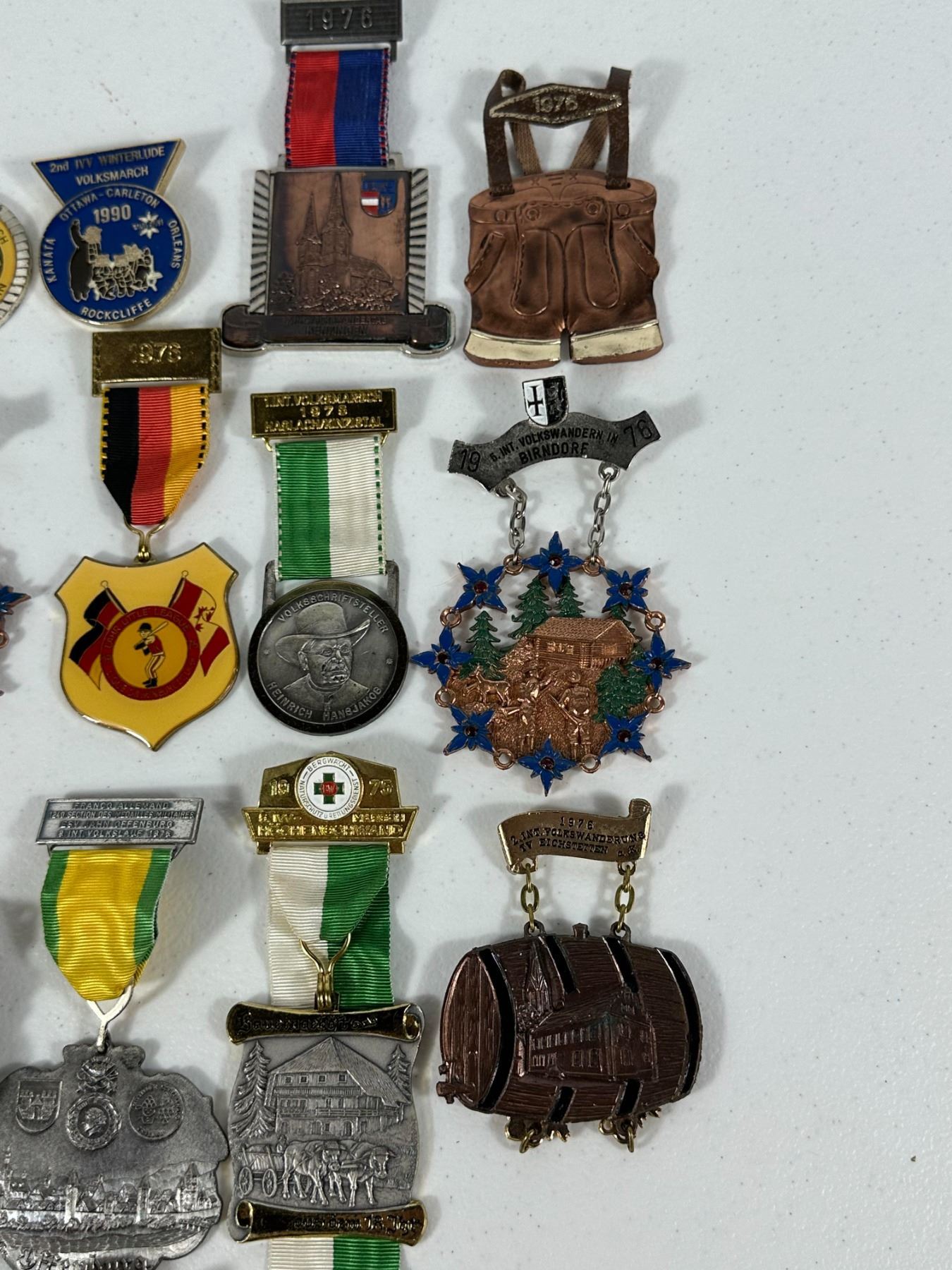 Includes assorted German souvenir and Volksmarch medals, pins, and ribbons (1970s–1990s) with a ceramic planter of boy and girl hugging.