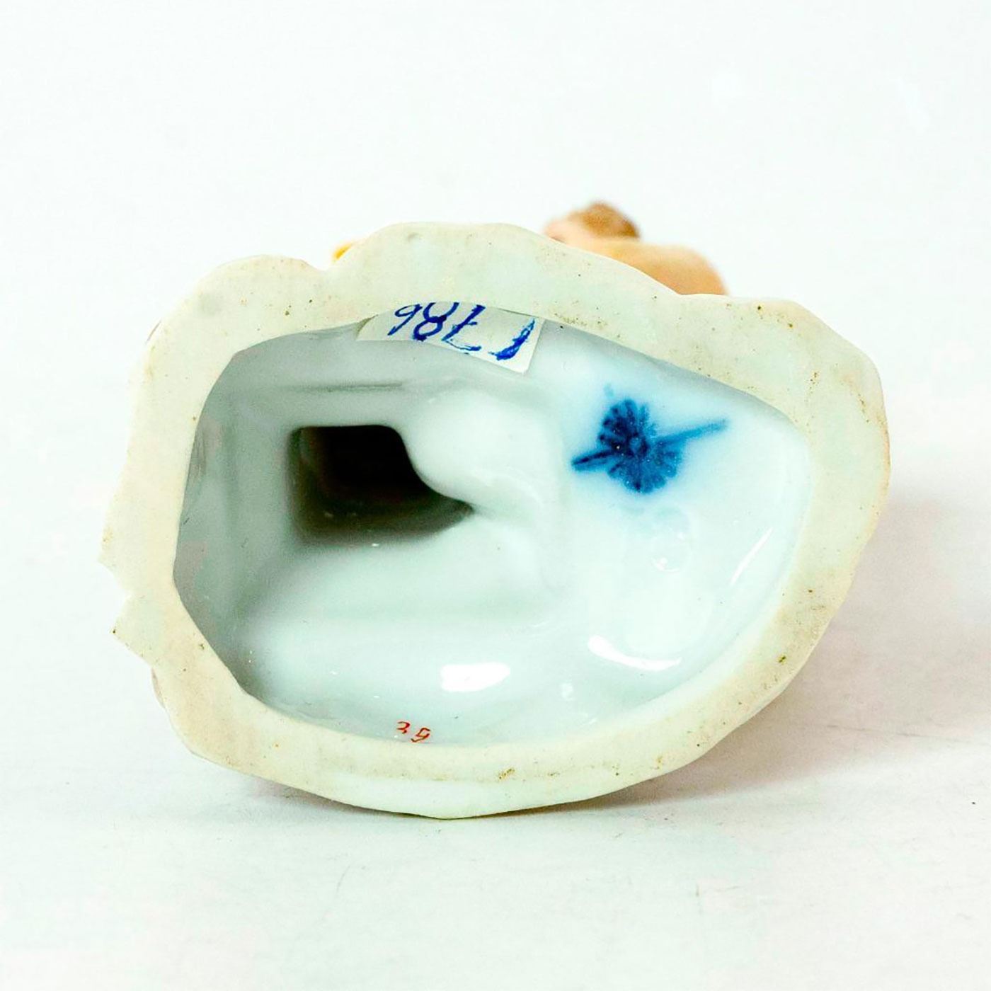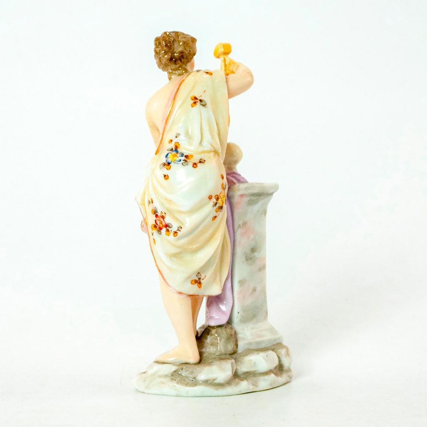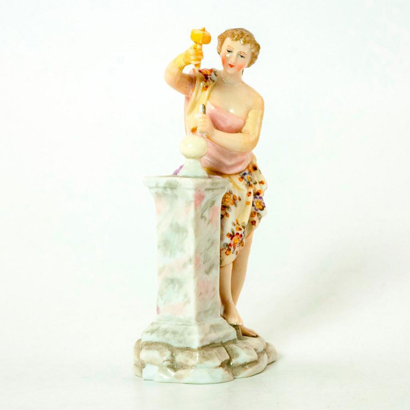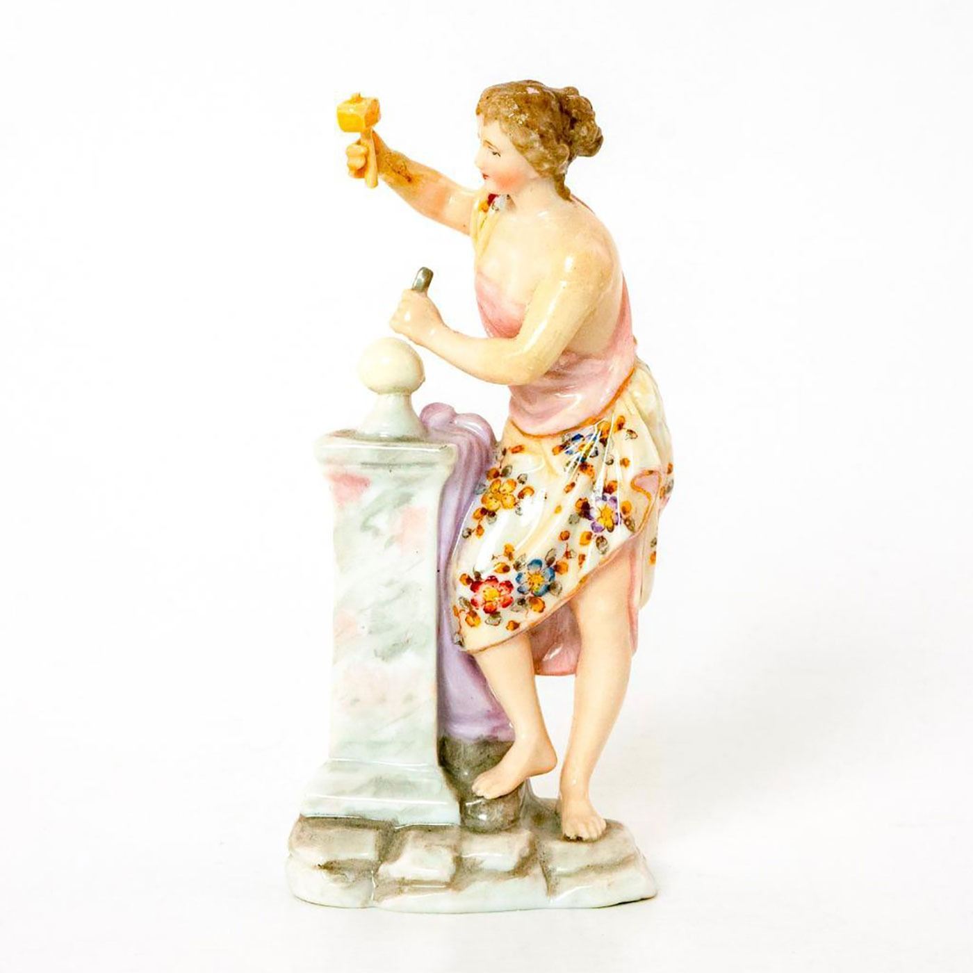Early version of the muse of sculpture. Dressed in a light pink floral Greek cloak, molding with hammer and chisel. Triebner & Co. Volkstedt backstamp. Thumb and hammer seem to have been broken and re-glued.