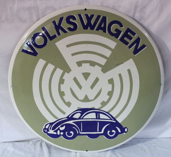 Single-sided. 20" diameter. With Volkswagen logo and car. Age unknown, due to not finding a reference. Beautiful sign, great graphics