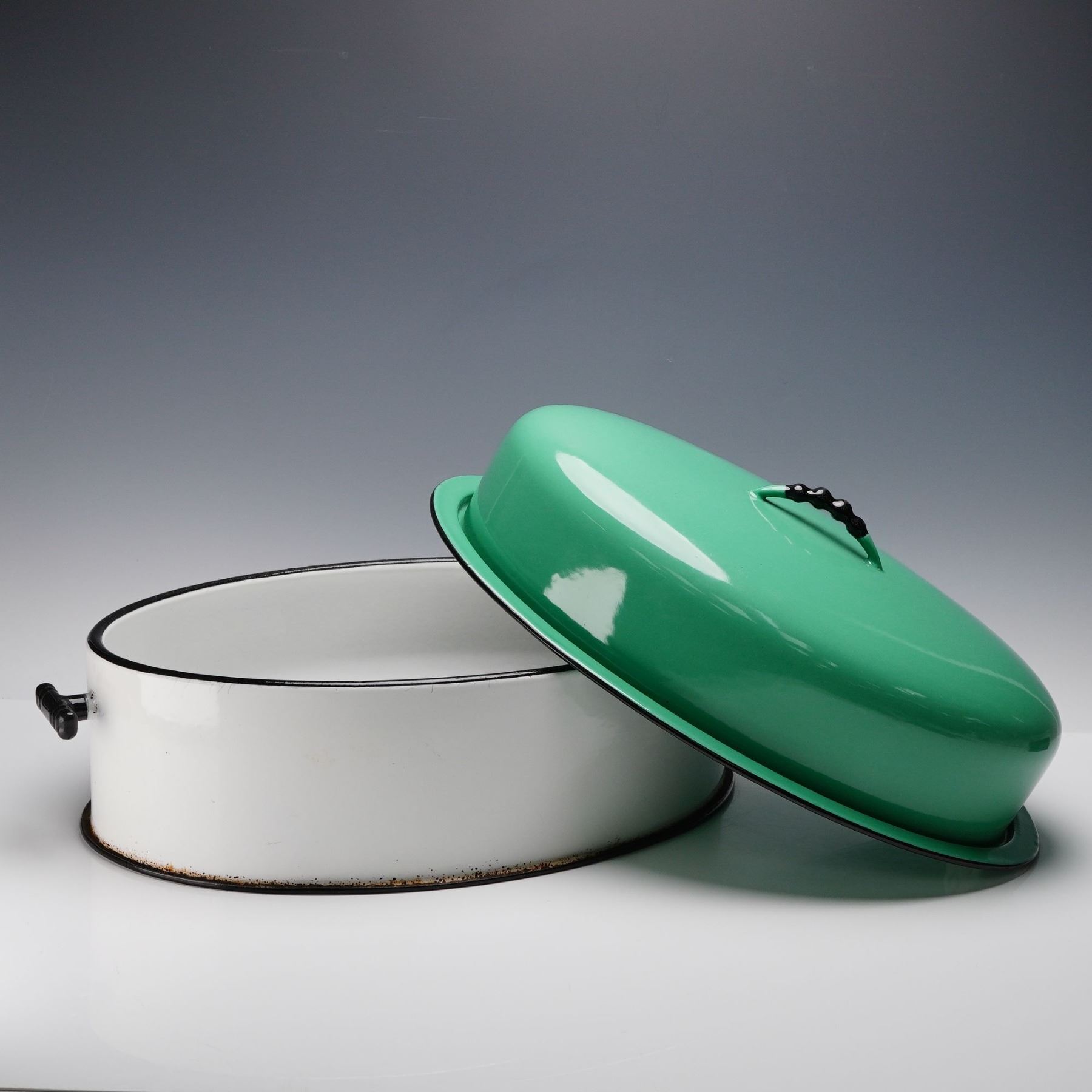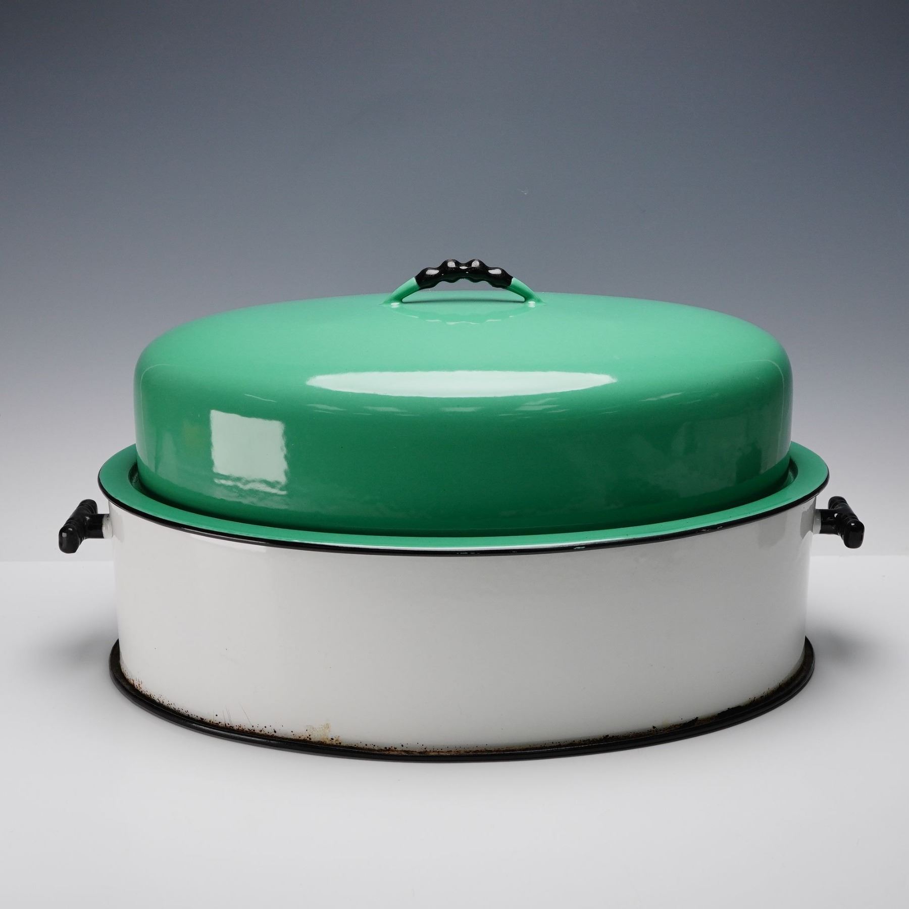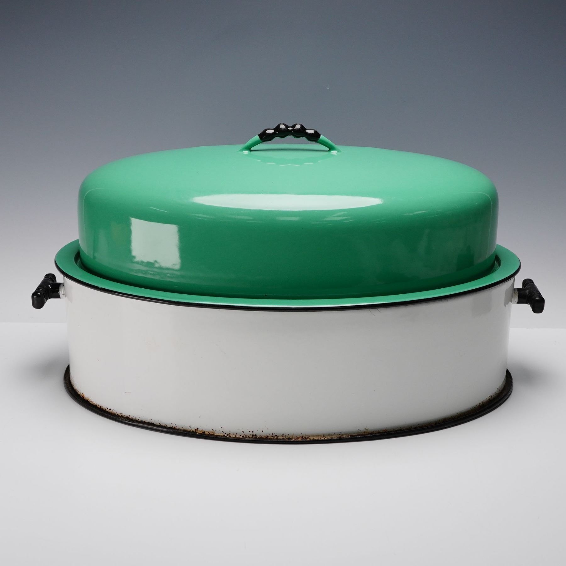 Vintage Vollrath Kook King Ware oval roasting pan featuring a glossy green enamel domed lid and white enamel base with black trim and handles. A fine example of mid-century enamelware design, this piece combines functionality with bold retro color appeal. The heavy-gauge enamel construction ensures durability, while the bright two-tone finish adds vintage charm for kitchen or display use. Marked Vollrath Kook King Ware on the underside.
