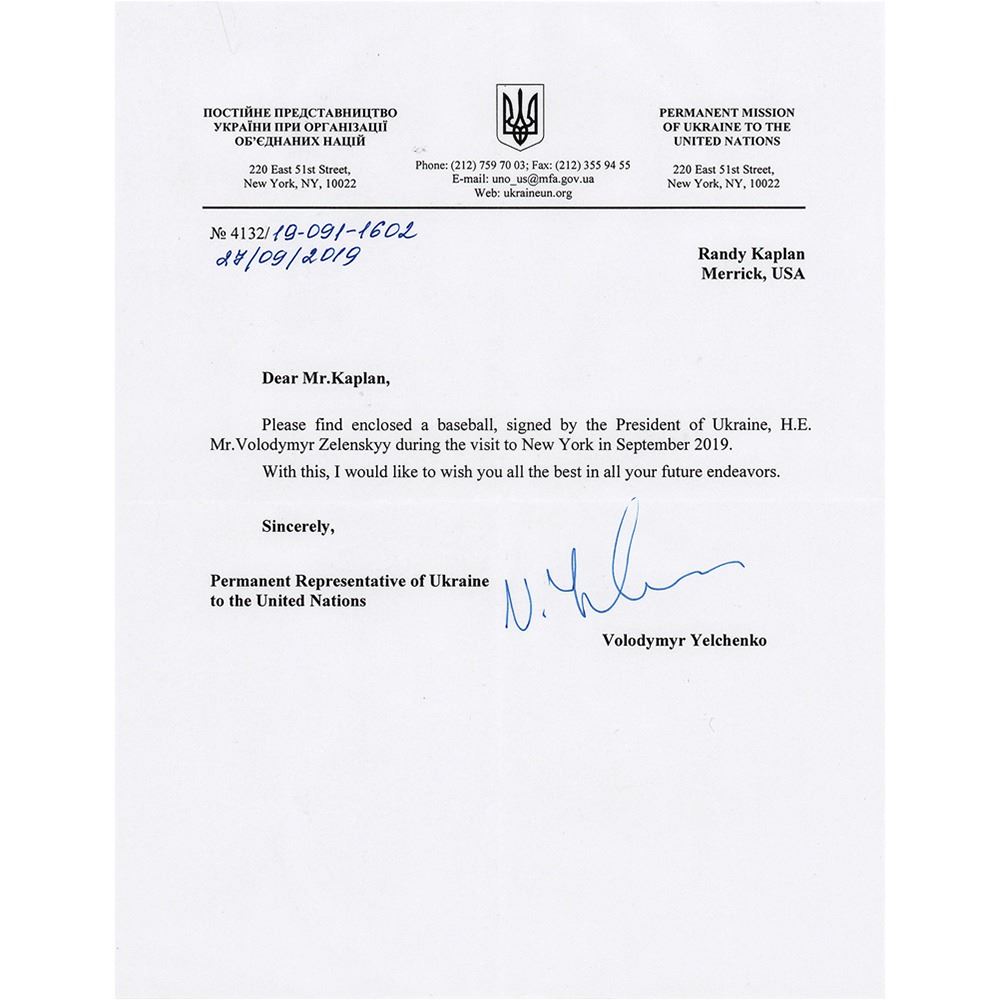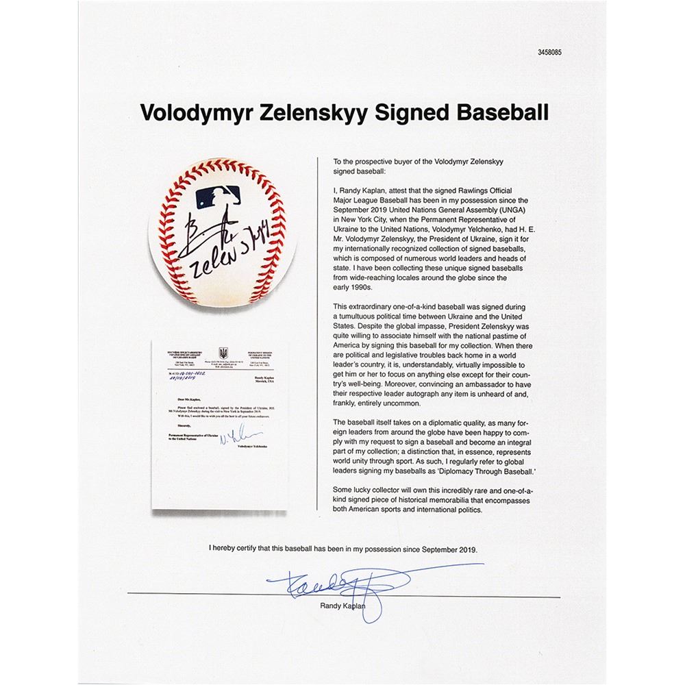 Official Rawlings Major League (Manfred) baseball signed in black felt tip on a side panel in Ukrainian cursive and English print, "Zelenskyy." In very fine condition. Accompanied by a transmittal letter signed by Volodymyr Yelchenko, Permanent Representative of Ukraine to the United Nations, in part: "Dear Mr. Kaplan, Please find enclosed a baseball, signed by the President of Ukraine, H.E. Mr. Volodymyr Zelenskyy during the visit to New York in September 2019." Also includes a full letter of authenticity from PSA/DNA.