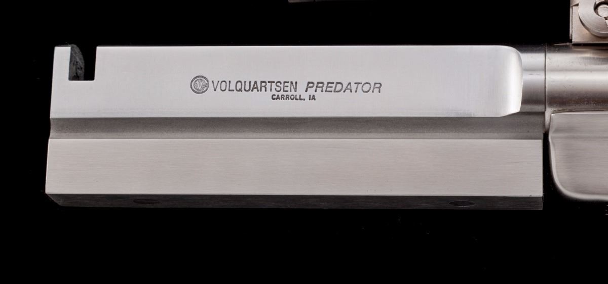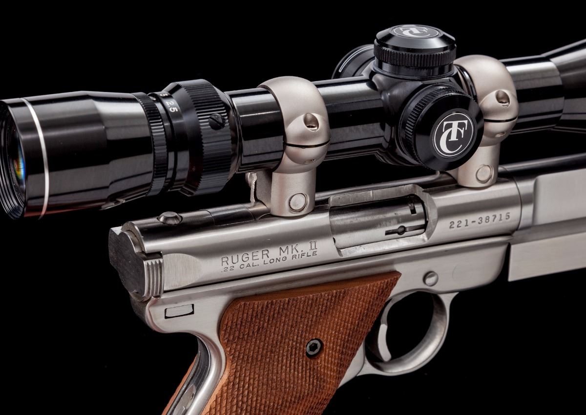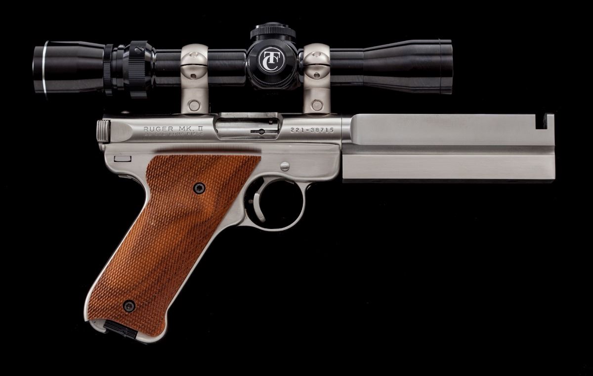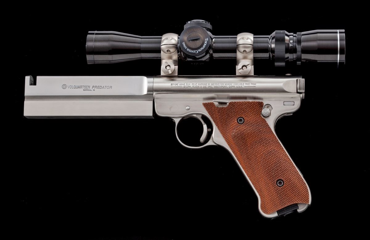 Volquartsen Modified Ruger MK II Semi-Automatic Target Pistol, #221-38715, .22 LR cal., 6'' Volquartsen Predator heavy target barrel, stainless steel, Volquartsen target trigger, aftermarket checkered hardwood grips, with one factory Ruger magazine. Topped with a Thompson Center Arms 2.5-7x28 scope. Condition is excellent showing normal signs of light use and handling, including a small amount of scattered fine scratches and impressions. Action is tight, bore is bright, scope optics are clear. Est.: $900-$1,200. (Modern/PPT)