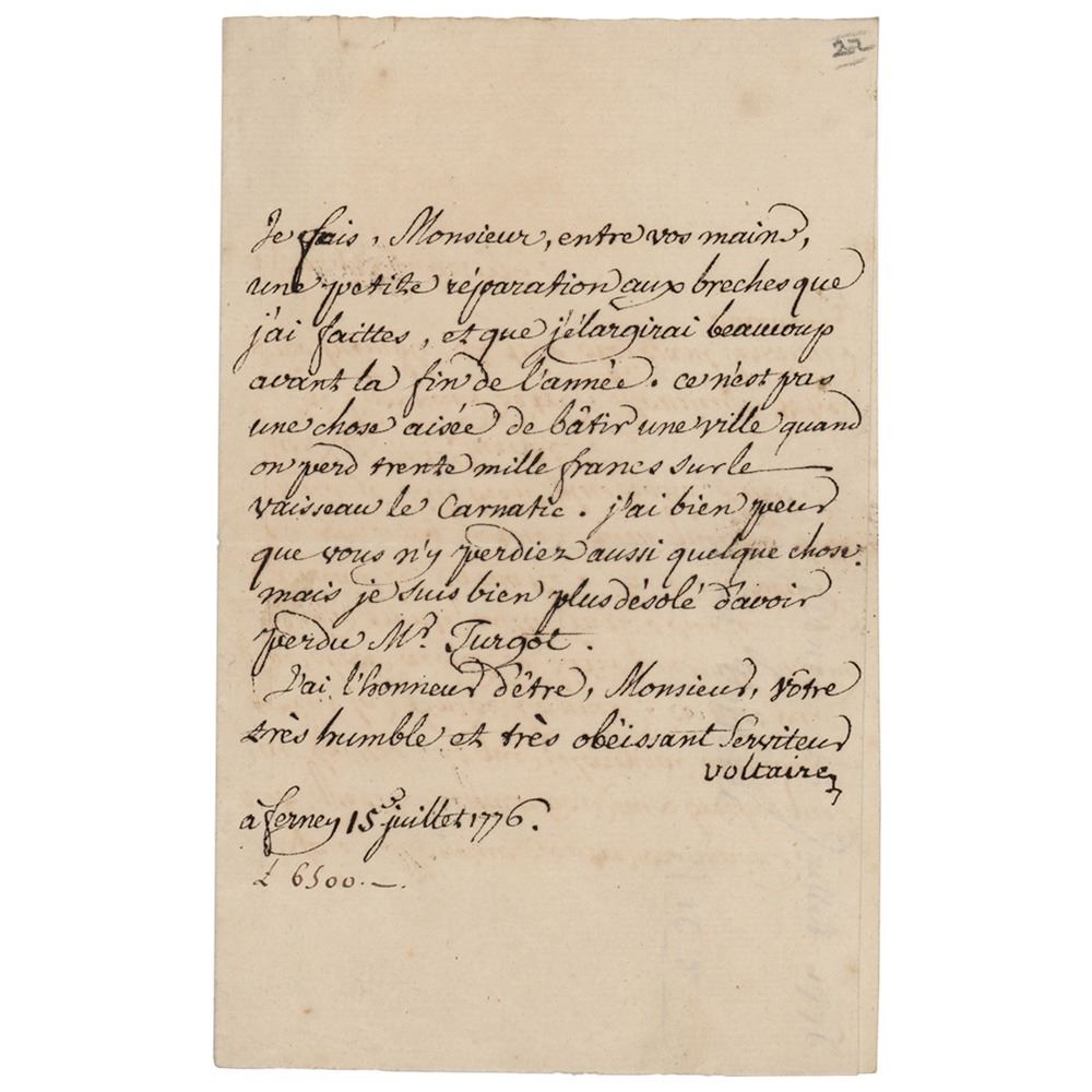 LS in French, signed ‰ÛÏVoltaire,‰Û one page, 3.75 x 6.25, July 15, 1776. Letter written from his home at Ferney, lamenting financial losses caused by the sinking of a ship. In full (translated): "I place into your hands, Monsieur, a small act of atonement for the breaches that I have caused and that I made a great deal larger before the end of the year. It is no easy thing to build a city when one loses thirty thousand francs on the ship Carnatic. I am quite afraid that you have lost something there also, but I am far more grieved to have lost Monsieur Turgot." In fine condition.