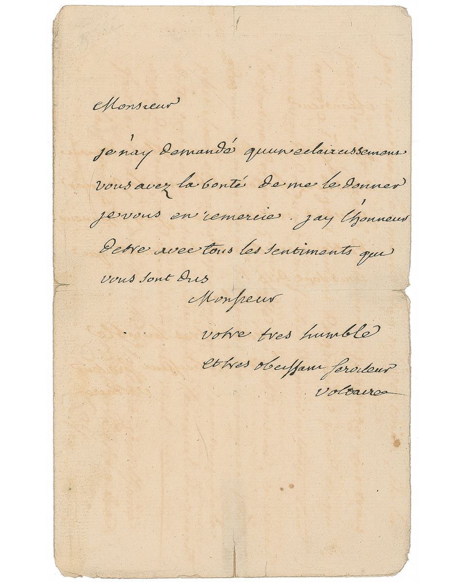 ALS in French, one page, 4.5 x 7.5, no date but a docketing notation to the reverse indicates the letter was received at Ferney on August 4, 1764. A terse message to a gentleman, seemingly regarding a misunderstanding. In full (translated): “I have asked for nothing other than an explanation. You have been good enough to give it to me. I thank you for it. I have the honor of being, with all the feelings that you deserve, Sir, your very humble and obedient servant.” In very good condition, with central vertical and horizontal folds with small tape-repaired edge separations, mirrored ink from a letter or document no longer present, and slight soiling. Whatever the disagreement may have been, it gave Voltaire the opportunity for displaying his most elegant and ironic contempt, observing all the polite formalities of correspondence, while inserting subtle hints of his disdain. This letter also marks a notable year in Voltaire’s career, as it saw the publication of his Dictionnaire Philosophique, one of his best-known philosophical works. Handwritten letters from Voltaire are rarely as neat and clearly signed as in this interesting one-page example.