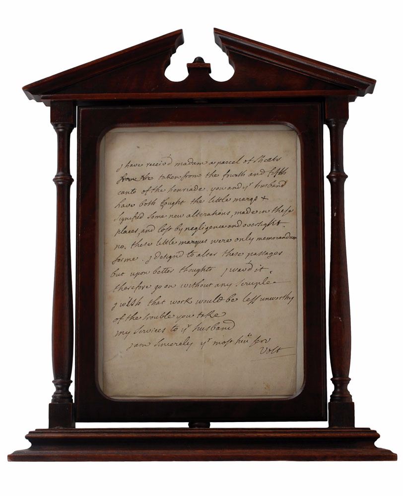 ALS in English, signed “Volt,” one page, 5.25 x 7.25, no date but circa early 1740s. Letter to Prault, a printer and bookseller. In full: “I have receiv’d madam a parcel of sheets taken from the fourth and fifth canto of the Henriade. You and yr husband have both thought the little marqs signified some new alterations, made in these places, and lost by negligence and oversight. No. These little marques were only memorandum for me. I designed to alter these passages but upon better thoughts I wav’d it, therefore go on without any scruple. I wish that work would be left unworthy of the trouble you take.” Apparently affixed to a slightly larger sheet and displayed within a rotating wooden frame with an engraved portrait on the opposite side to an overall size of 10 x 12. In fine condition.
