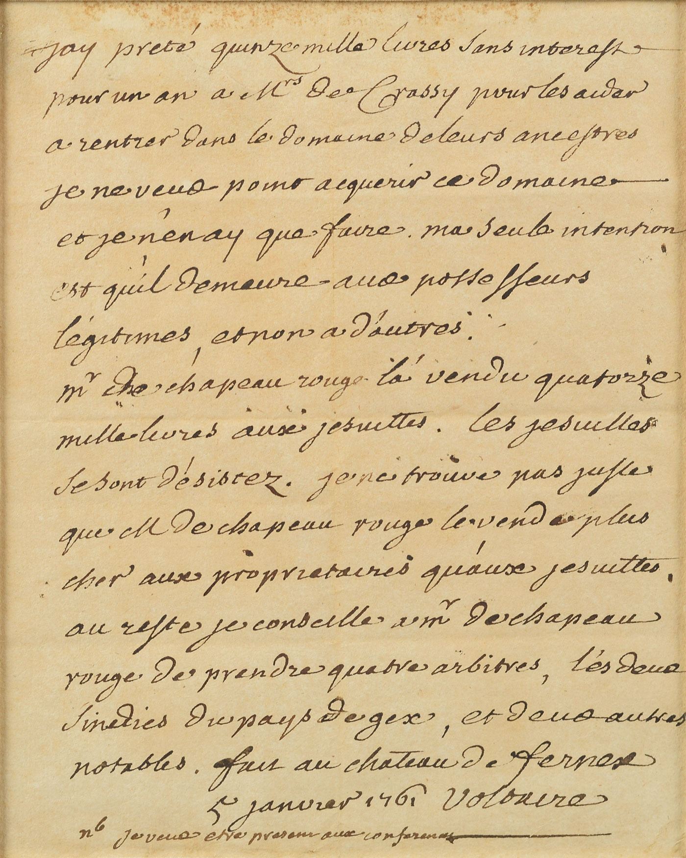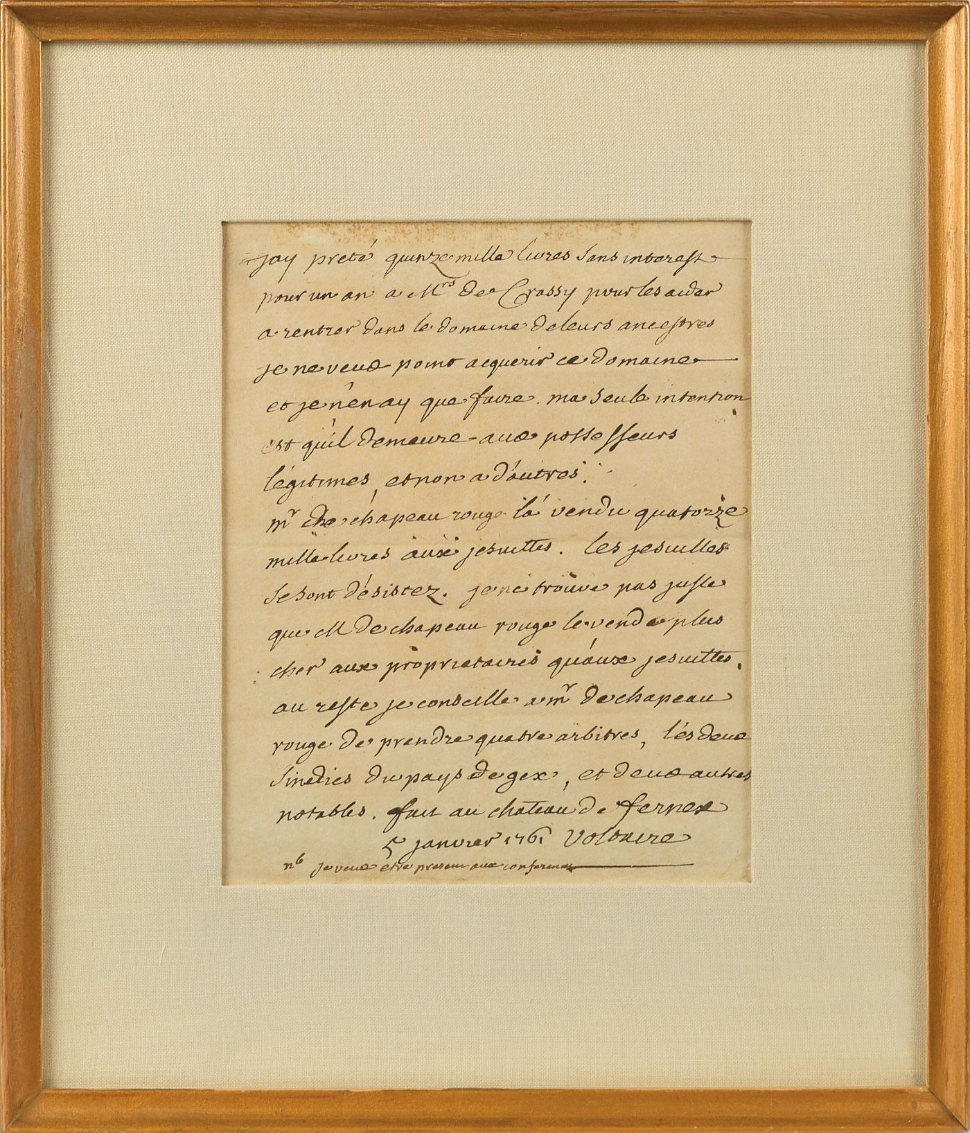 Neatly penned partial autograph document in French, signed "Voltaire," one page, 6.5 x 8, January 5, 1761. The untranslated document appears to concern a business transaction, with Voltaire stating that he has paid the interest on land owned by the de Crassy family; he then confirms that he does not want the land, but rather to see it remain with its 'legitimate owners.' Cloth-matted and framed to an overall size of 11.75 x 13.75. In fine condition, with light staining along the top edge.