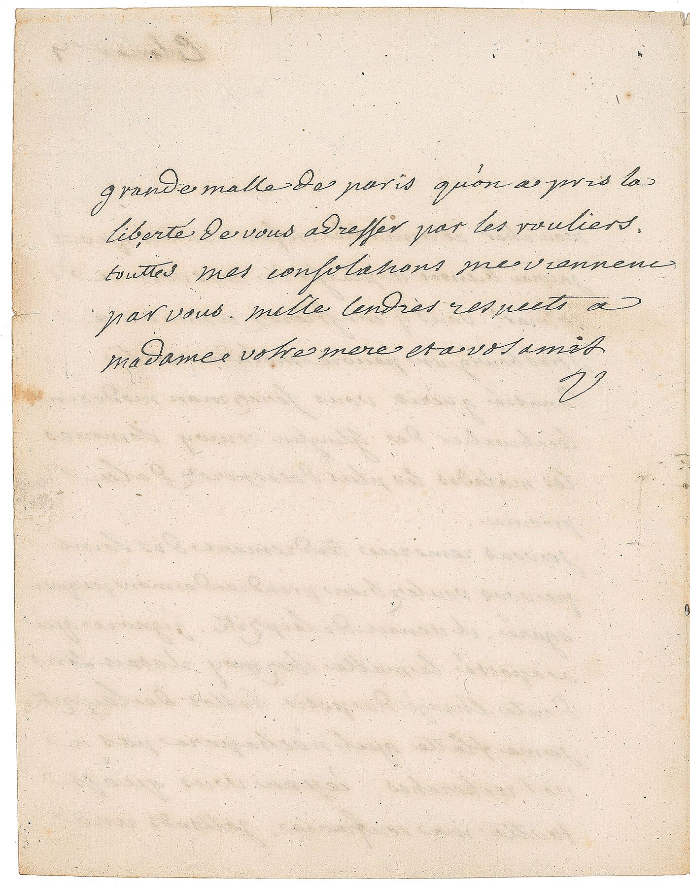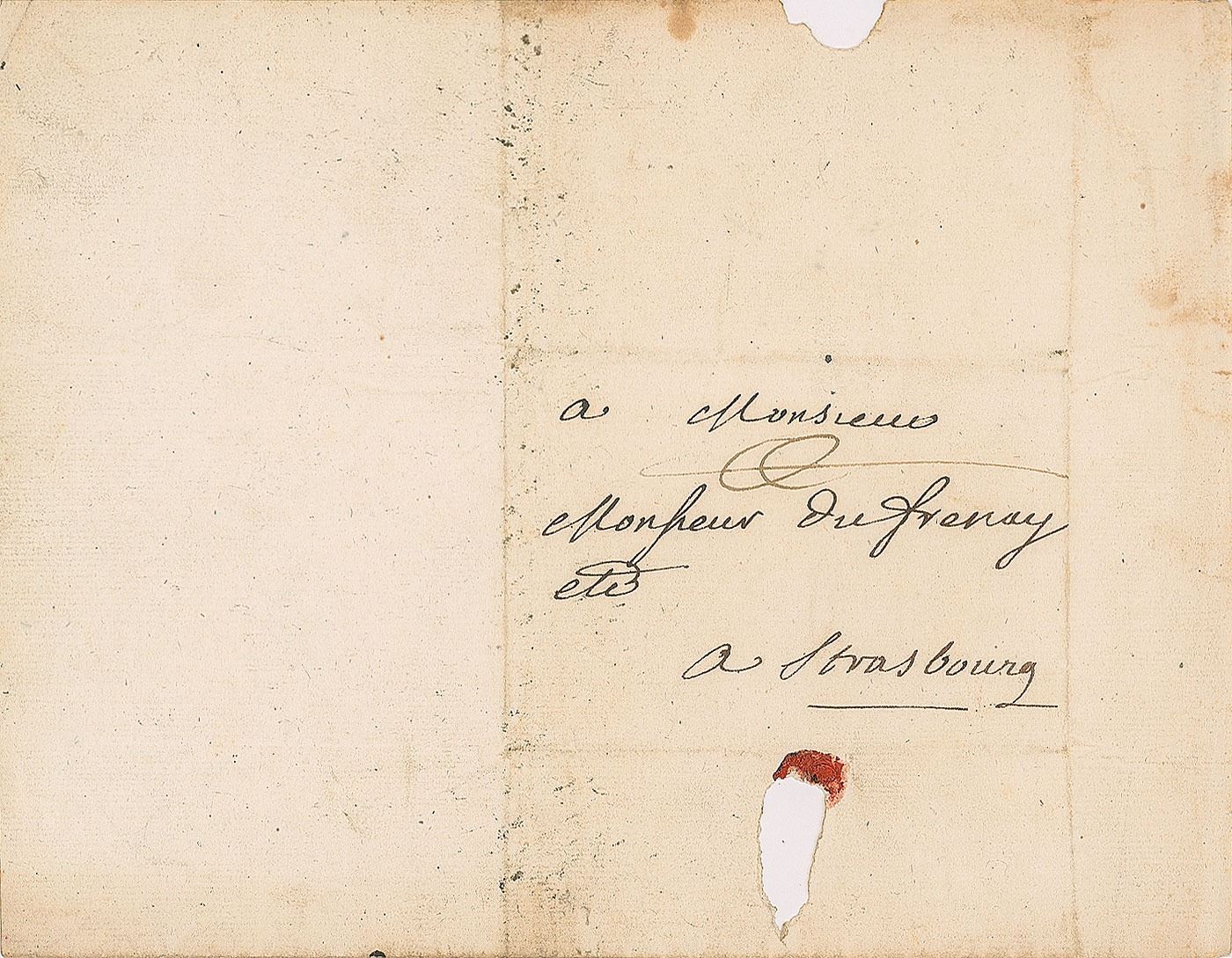 ALS in French, signed “V,” one page both sides, 7 x 9, no date but circa 1753–1754. Letter to Francois-Louis Defresney, director of the post in Strasbourg, in part (translated): "My dear and lovely child, some people tell me that I will have the pleasure to meet you in Colmar. You will comfort, just like in Strasbourg, a poor ill man and if friendship can heal, you will be my doctor. The Knight of Klinglin and I are the most desperate ill men in the whole province. I am very thankful to you for your kind attention towards my lost luggage. It was coming from Leipzig. I do not know who brought the case at my house. He was probably also in charge of my luggage from Leipzig. I am sure that this will be under your control. I am also expecting a trunk from Paris that has been sent to you by carters. All my consolations come from you. Thousands of tender respects to your mother and to your friends." Addressed on the integral address leaf in Voltaire's hand. In very good to fine condition, with scattered creasing, and seal-related paper loss to the integral address leaf. Voltaire lived in Colmar from October 1753 to November 1754, where he focused on compiling a lengthy synthesis of German history entitled Annals of the Empire.