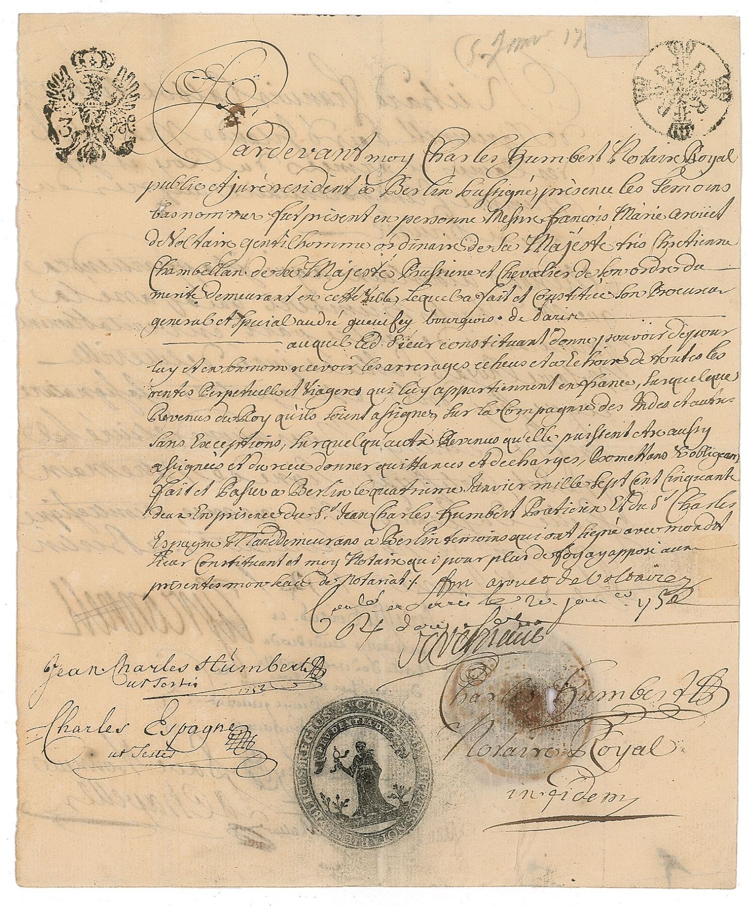 Manuscript DS, in French, signed “F. M. Arouet de Voltaire,” one page both sides, 7.5 x 9, January 4, 1752. Untranslated document signed at the conclusion by Voltaire using his given name, and countersigned by Royal Notary Charles Humbert. The reverse is signed by several people, including Richard Francois Talbot, comte de Tyrconnell. In fine condition, with a small hole to the seal area.