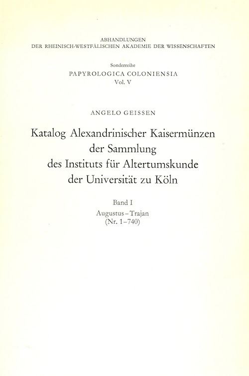Geissen, Angelo. KATALOG ALEXANDRINISCHER KAISERMÜNZEN DER SAMMLUNG DES INSTITUTS FÜR ALTERTUMSKUNDE DER UNIVERSITÄT ZU KÖLN. BAND 1: AUGUSTUS-TRAJAN (NR. 1-740). Opladen, 1974. 8vo, original blue cloth, gilt; jacket. 226 pages; illustrated throughout. Fine. Infrequently available. Abhandlungen der Rhenisch-Westfälischen Akademie der Wissenschaften, Sonderreihe Papyrologica Coloniensia, Vol. V. Clain-Stefanelli 4522*. Kroh 53 (five stars): “There is an excellent variety of material presented (about 95% of all known types) and they are cross-referenced to every possible publication making this a ‘one-stop’ reference for nearly all coins of this area... Definitely essential for the specialist, and recommended to all others."