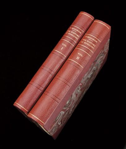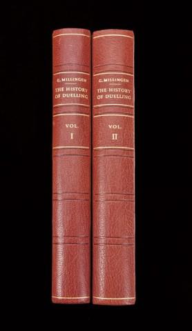 Volumes 1 and 2, The History of Dueling, by J. G. Millingen, published London, 1841. Professionally rebound in very good condition. Fly page reads “Narratives of the most remarkable personal encounters that have taken place from the earliest period to the present time. Lists famous duels from the time of William the Conqueror, detailing duels from 1765 – 1840. The personal accounts and great research. A rare set which is indispensable to the student of dueling. From the William R. Orbelo Collection. Est: $1,000 - $3,000