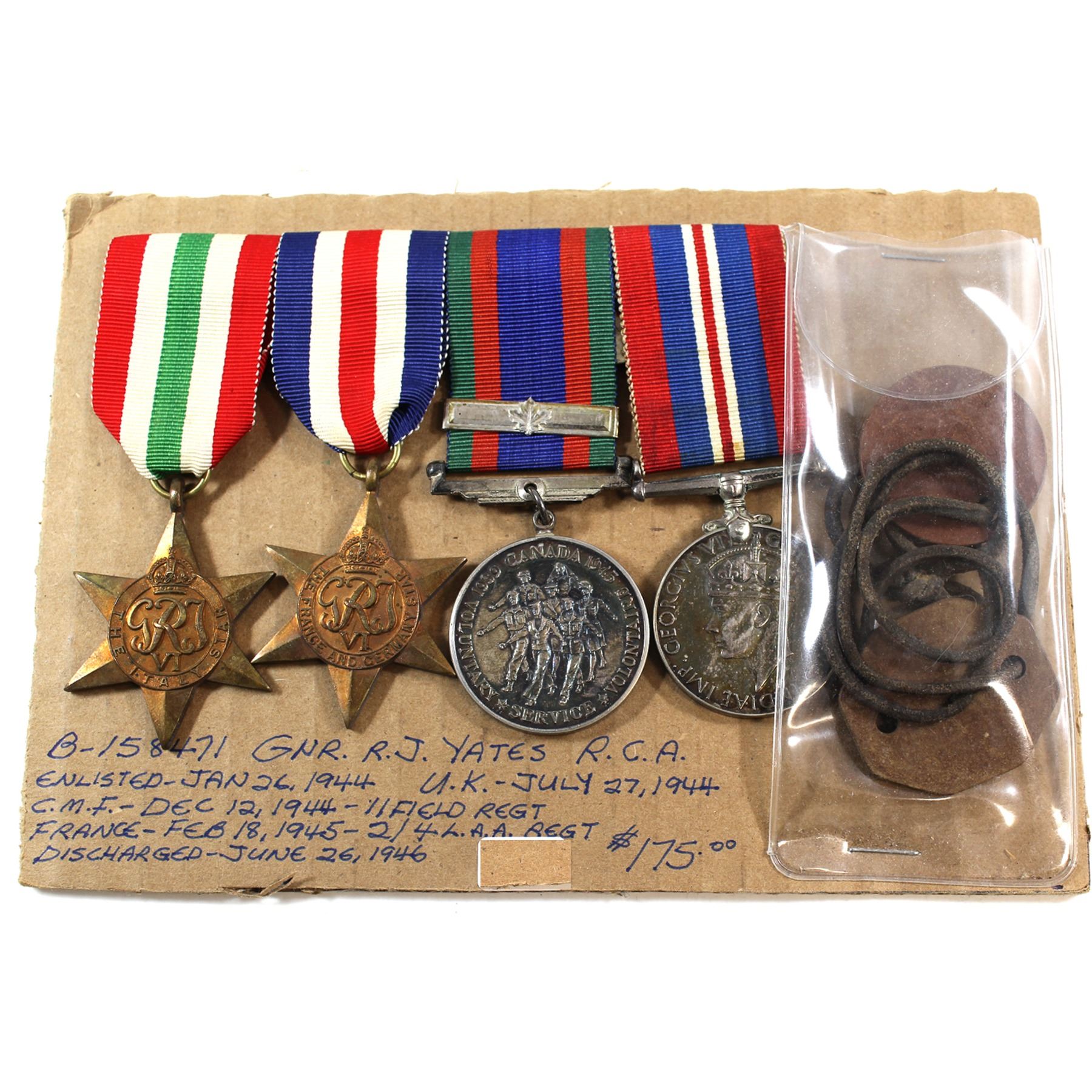 Voluntary WWII Medal, 1939-1945 War Medal, The Italy Star, The France and Germany Star & Dog Tags. General R.J. Yates R.C.A. 6pcs