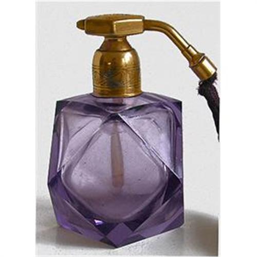 This Art Deco perfume atomizer bottle Produced by Volupte, circa 1930, from heavy purple crystal with very high quality engraved brass fittings and glass inner tubing. Featuring an Art Deco - Machine Age three-dimensional cubic design. Measures about 3 1/4 inches cubed. With the exception of the hardened bulb and frayed chord, due to age, this exceptional Volupte perfume atomizer, as highly prized as Devilbiss, is in excellent condition.