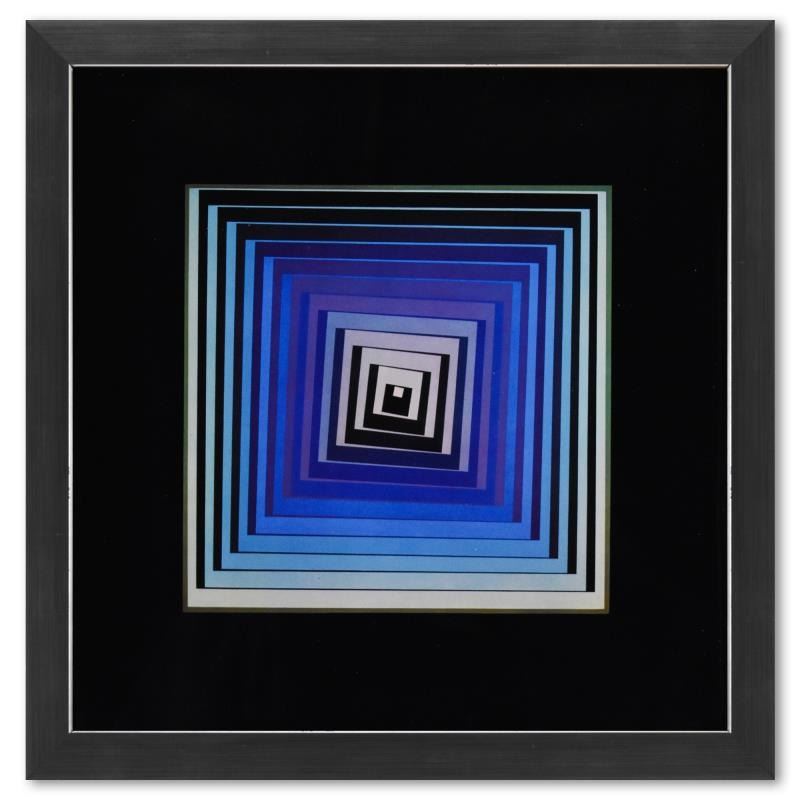 "Vonal - Lila de la serie Vonal" is a heliogravure print on paper, published in 1971, by Victor Vasarely (1908-1997). This piece comes custom framed, with a letter of authenticity and with a 1976 Vasarely paperback. Measures approx. 11.5" x 11.5" (frame), 7" x 7" (image).