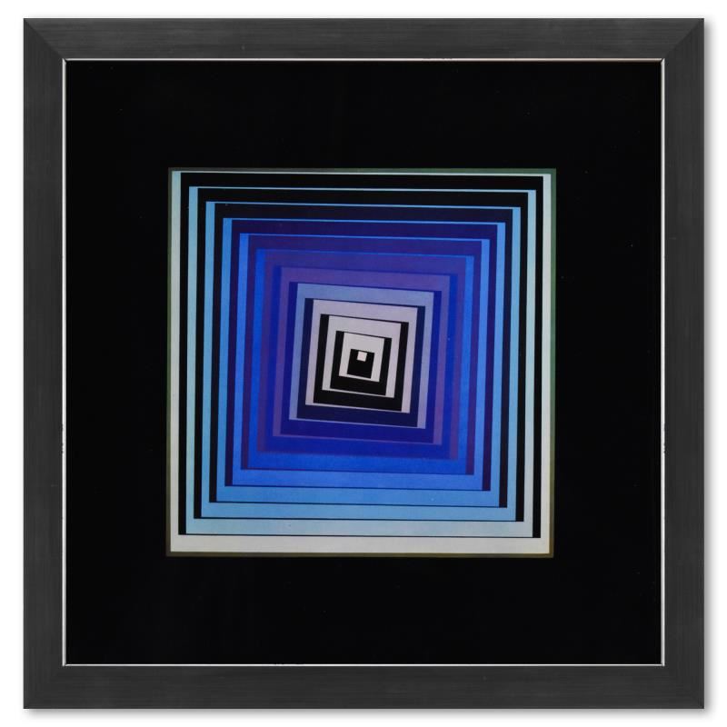"Vonal - Lila de la serie Vonal" is a heliogravure print on paper, published in 1971, by Victor Vasarely (1908-1997). This piece comes custom framed, with a letter of authenticity and with a 1976 Vasarely paperback. Measures approx. 11.5" x 11.5" (frame), 7" x 7" (image).
