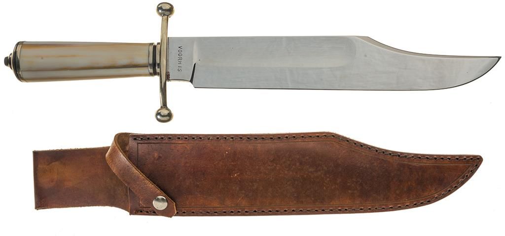 17 1/2" overall, 11 3/4" clip point blade, German silver fittings, polished stone grip, leather sheath. Good, with mild spotting.