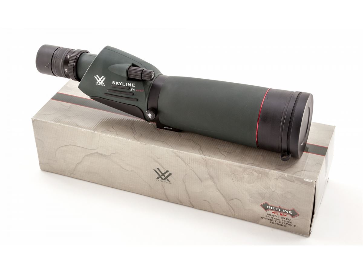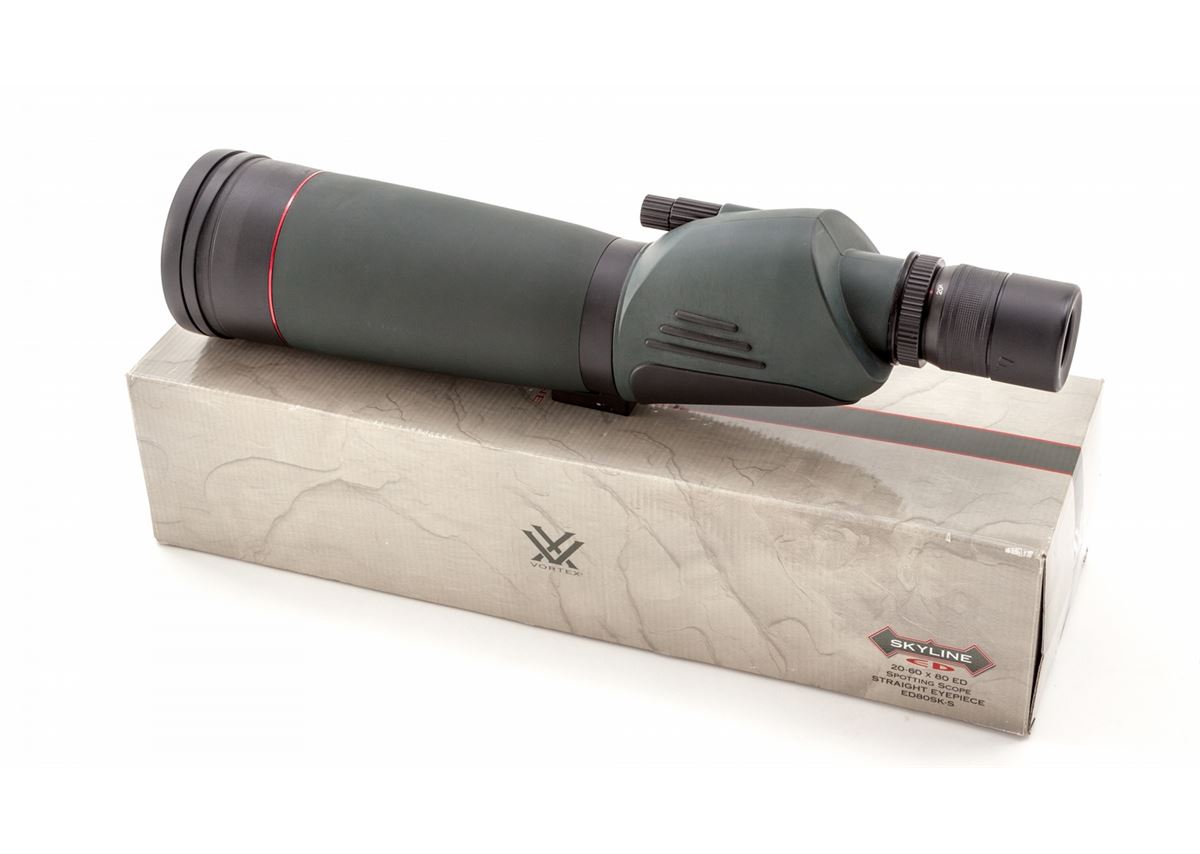 Vortex Skyline Spotting Scope, 20-60x80 ED, with straight eyepiece, 17.7'' in length, 19-18mm eye relief, 113-55 ft. @ 1000 yards field of view, waterproofed and fogproofed. With carrying case. Condition is excellent, as new in original box, no instructions. Retails @ $641.95. Est.: $350-$500. (Field Time)