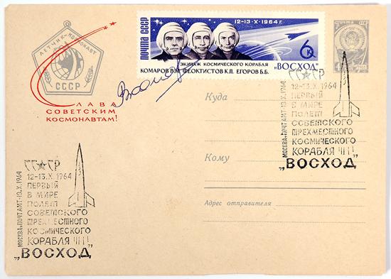 Voshkod 1, 1964, Komarov Autograph. On a launch cover with a special 6k commemorative stamp issued in honor of the flight and cancelled by a handstamped cancel. Extremely rare as Komarov was killed in 1967 on Soyuz 1. He was the first human confirmed to have died in space.