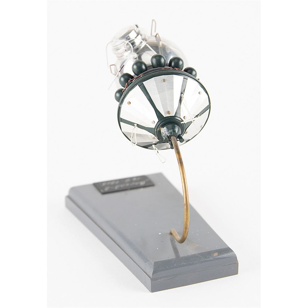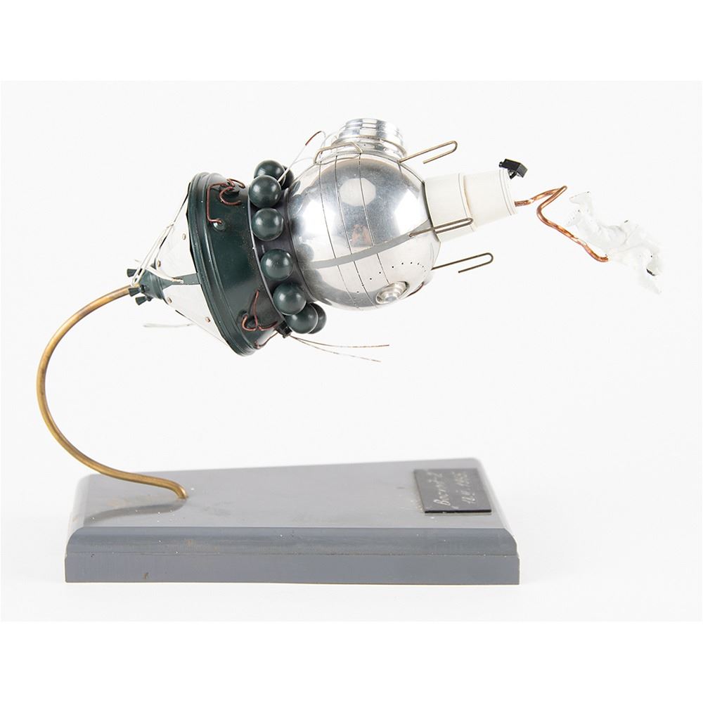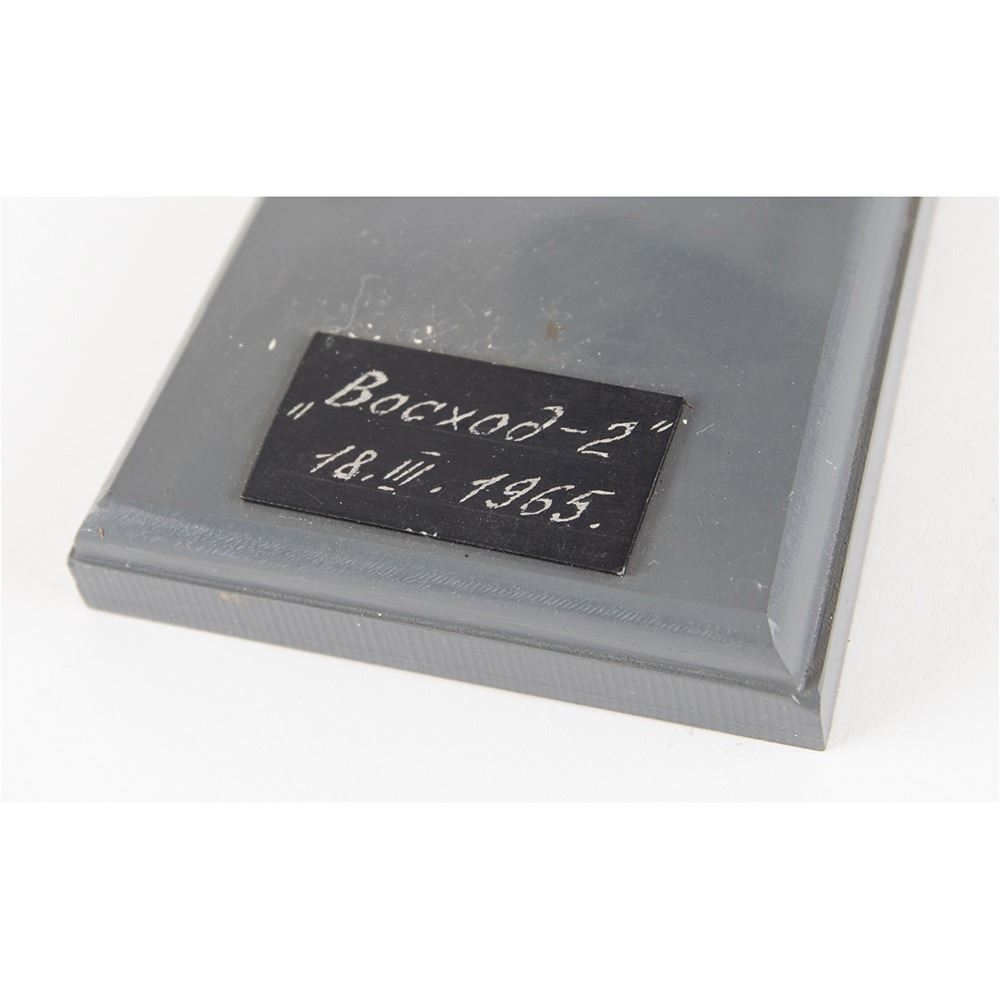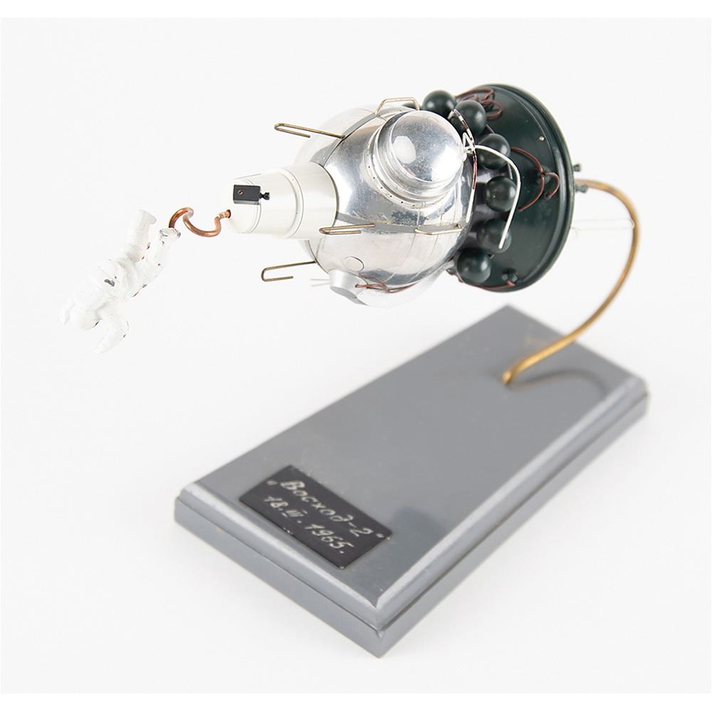 Appealing vintage Russian-built scale model of the Voskhod 2 spacecraft complete with miniature cosmonaut spacewalker, measuring an overall 6.5è long, set upon a gray base with plaque inscribed in Cyrillic: "_Õ__„„É___«-2, 18.III.1965." Crafted from metal, plastic, and composite materials, the model is a fantastic representation of the mission that saw mankind's first spacewalk. On March 18, 1965, cosmonaut Alexei Leonov performed a 12-minute extravehicular activity while orbiting Earth in the Voskhod spacecraft. In very good to fine condition, with light general wear, particularly to the paint on the cosmonaut, and some of the antennas bent.