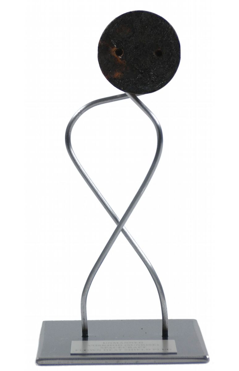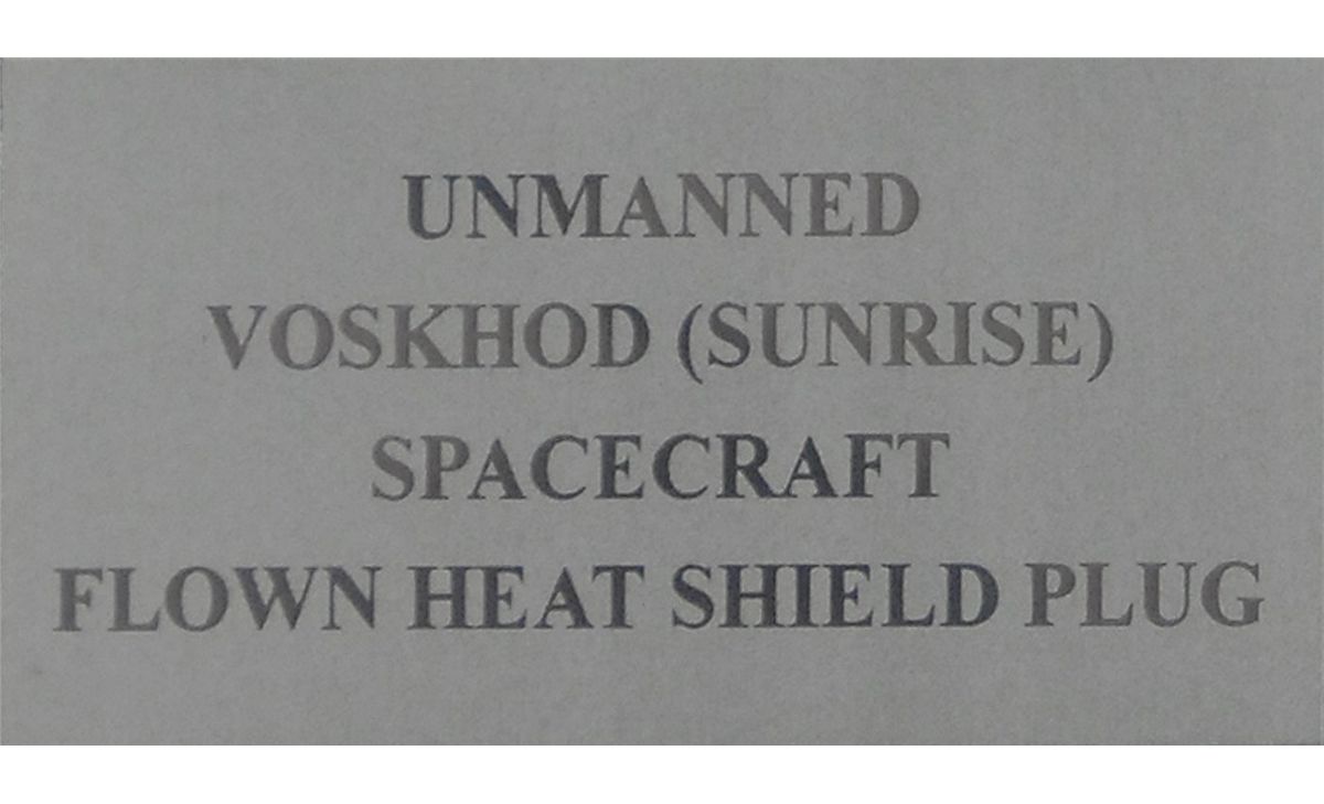 Very uncommon flown heat shield plug carried on the unmanned Voskhod (Sunrise) spacecraft. Plug measures approximately 2” in diameter with expected charring to the surface and is affixed to an 8.5? vertical mount with an informational plaque affixed to the base. Only three unmanned Voskhod flights were undertaken between 1964 and 1966.