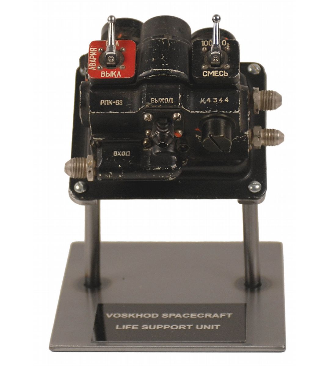 Life support unit to be used on board Voskhod–1. Unit measures approximately 5 x 4.25 x 4.5, with several input and outputs on the side (all labeled in Russian), as well as two switches on the face (again both labeled in Russian), one for 100% oxygen, the other surrounded in red. Unit is affixed to a vertical display stand measuring almost 9? high with a descriptive plaque on the base. In fine condition, with expected wear from use.
