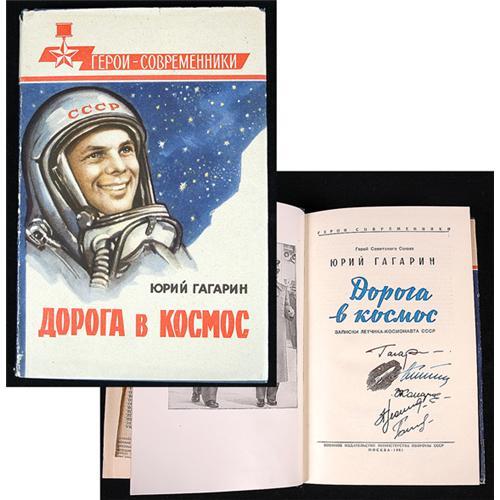 <Our item number 139823><B>Vostok 1, 1961, Gagarin, Titov, Komarov, Belyayev & Leonov Autographs.</B> On the title page of the Gagarin's 1961 book: "Road to Space" (Printing House of the Department of Defense, Moscow, 238pp., hard with dust jacket). This scarce book, written by the first human in space soon after his return to earth, is an important addition to any library. Being signed by the author, and additionally signed by his fellow cosmonauts makes it even more important. As an added fillip, the dust jacket on this volume is a rarer version that usually seen - and in generally great condition to boot. What more could you ask for. <BR>Estimated Value $1,000 - 1,500. <BR><BR>Our item number 139823<BR><IMAGES><P ALIGN="CENTER"><IMG SRC="http://www.goldbergcoins.net/liveauction/49jpegs/139823.jpg"> </P></IMAGES>