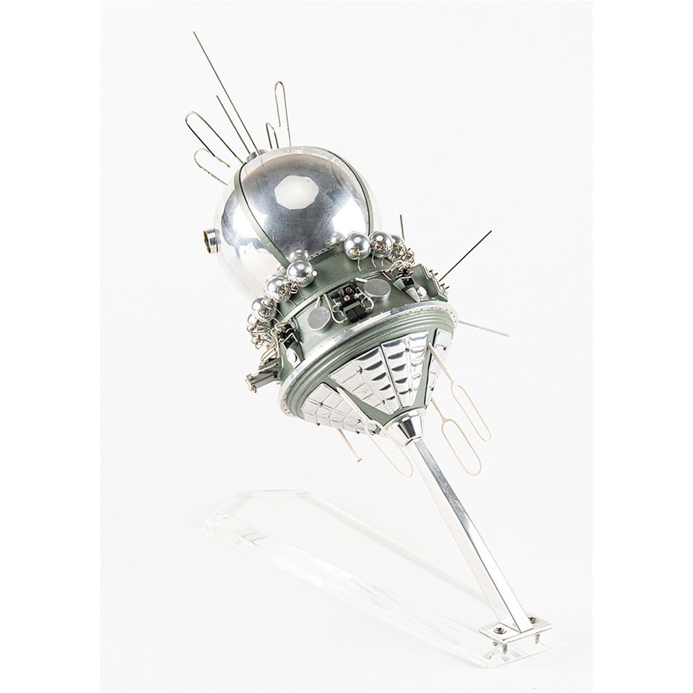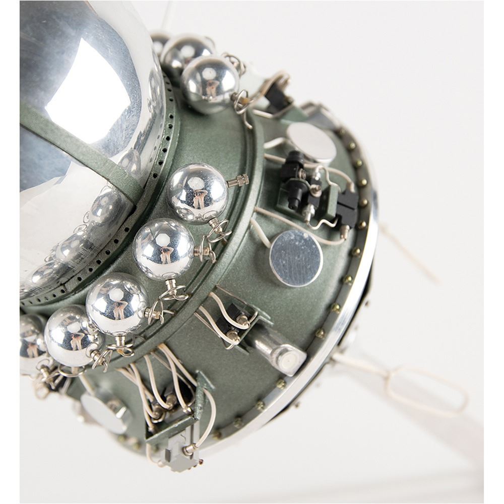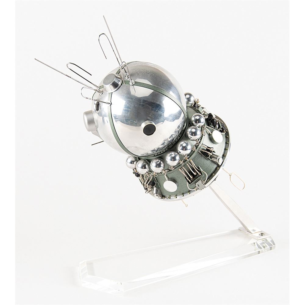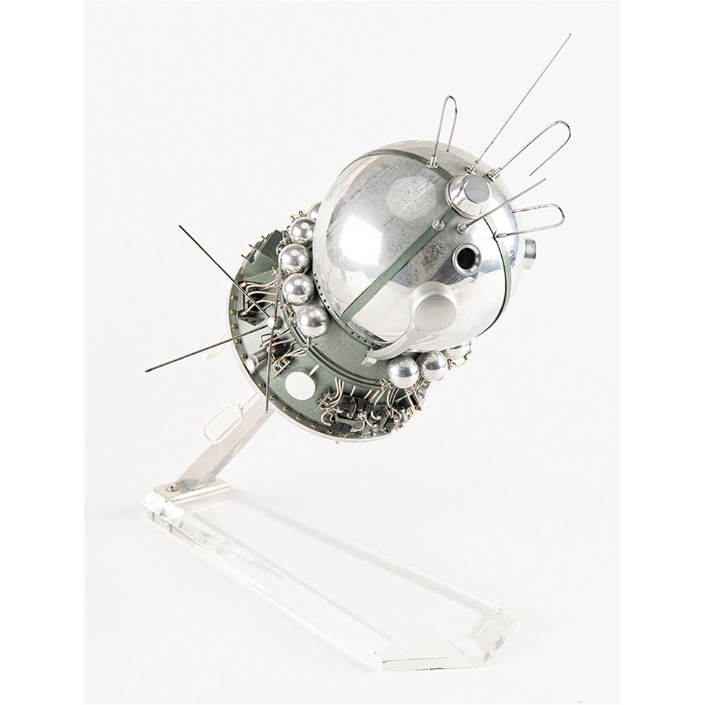 Vintage Russian-built scale model of the Vostok 1 spacecraft, measuring 13.5è long (including antennas), supported by a metal and acrylic stand. Crafted predominately from metal with a few plastic parts, the model renders the Vostok spacecraft in intricate detail, complete with antennas, pressurized gas tanks, scientific instruments, sensors, control shutters, and modules. In very good to fine condition, with the loop of one of the telemetry antennas broken but present. Vostok 1, launched on April 12, 1961, carried Yuri Gagarin into Earth orbit‰ÛÓmaking him the first human to journey into outer space. A highly displayable, thoroughly detailed model of his historic spacecraft.