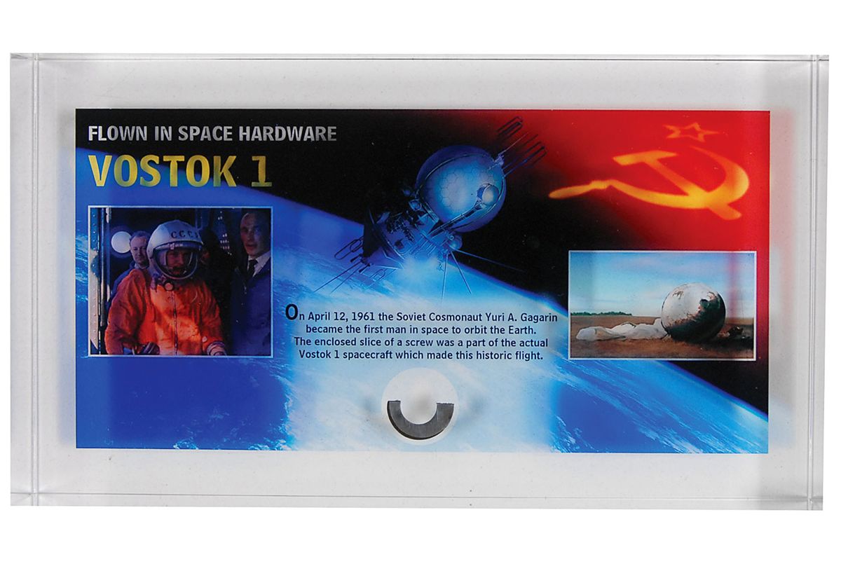 Flown bolt fragment from Yuri Gagarin’s historic Vostok 1 mission, housed in a 7 x 4 x 1 acrylic display featuring a translucent composite image related to the flight. In fine condition. Accompanied by a certificate of authenticity from Florian Noller, stating that this acrylic display is number 28 of 30 produced.