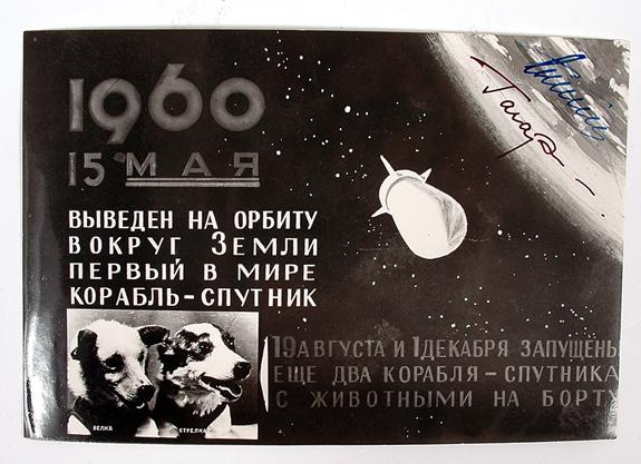 Vostok 2, 1963, Gagarin and Titov Autographs (6.5x4.5") An attractive black and white photo collage issued in honor of the launch of "Sputnik-2" and picturing the space dogs" Belka and Strelka". Since the dogs were not in any position to autograph this piece, it was signed by the first two cosmonauts in space, Gagarin and Titov. Unusual.