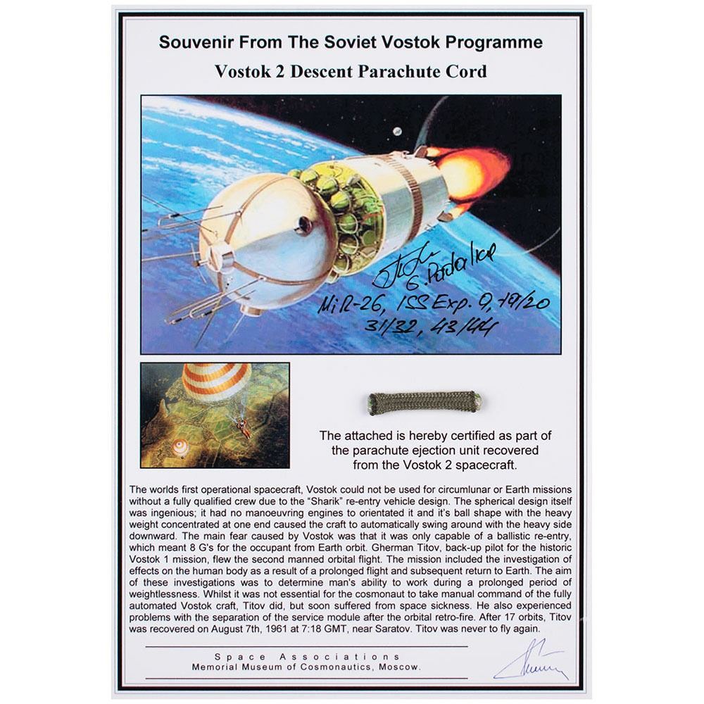 Flown 1.25è section of cord removed from the descent parachute of the Vostok 2 spacecraft, affixed to a color glossy 5.5è x 7.75è photo card prepared by the Memorial Museum of Cosmonautics in Moscow, signed above in black ink by noted Russian cosmonaut Gennady Padalka, who adds ‰ÛÏMiR 26, ISS Exp. 9, 19/20, 31/32, 43/44.‰Û In very fine condition.