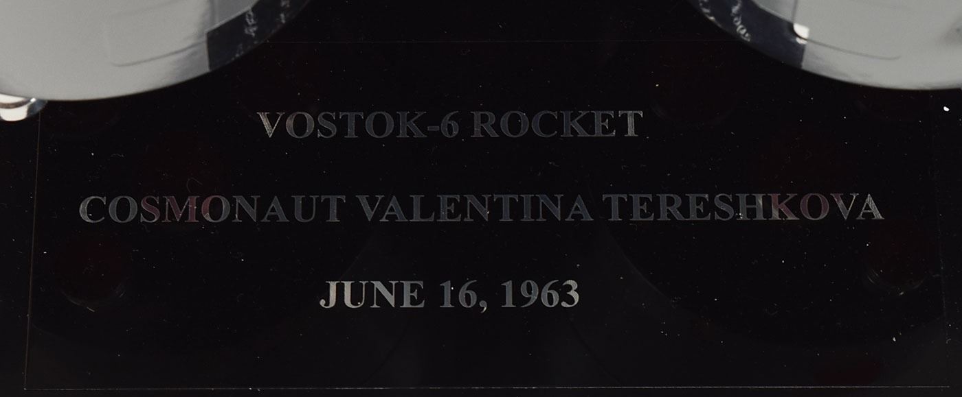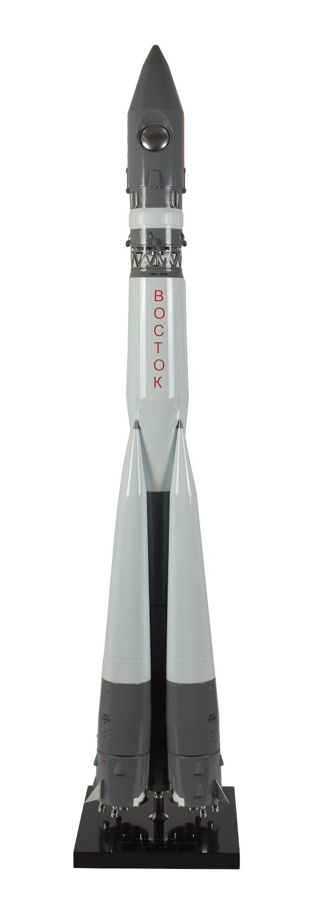 Brilliant 1:25 scale model of a Vostok 6 rocket made by S. P. Korolev of the Energia Rocket and Space Corporation. This model is constructed of fiberglass and metal, stands approximately 60? tall, and is set on an attractive 12.5 x 12.5 wooden base with descriptive plaque: "Vostok 6 Rocket, Cosmonaut Valentina Tereshkova, June 16, 1963.” The two-piece model separates at the second and third stage and is completed with the lower four boosters and upper adaptor and payload fairing, with model featuring affixed “??????” and USSR stickers. The first and second stages bear both the COSPAR designation, “1963-023A,” and rocket number: “8K72, E10325, ?.” In fine condition. On June 16, 1963, Cosmonaut Valentina Tereshkova became the first woman to journey into space when she took flight aboard the Vostok 6, the final mission of the pioneering Soviet human spaceflight project. During her nearly three-day voyage inside the famed ‘Seagull’ capsule, Tereshkova conversed with Premier Nikita Khrushchev over the radio and orbited the Earth an astounding 48 times. A robust, sensational model of the landmark Vostok 6.
