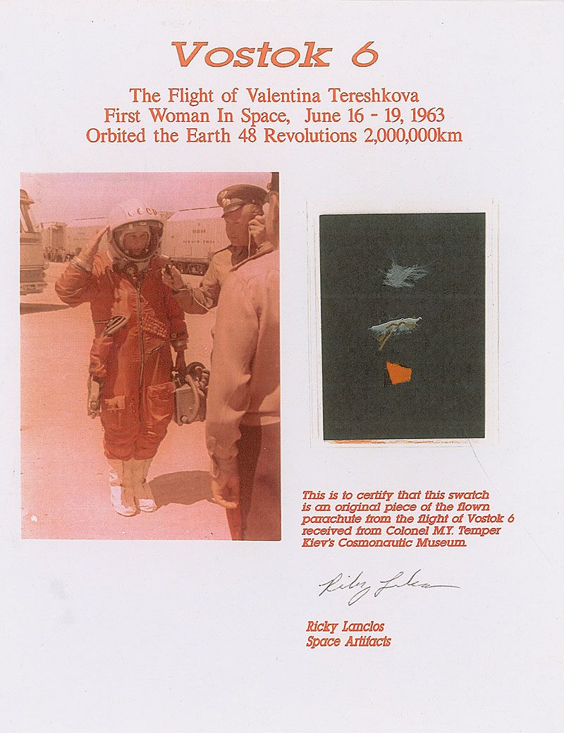 Three flown parachute pieces from Valentina Tereshkova’s Vostok 6 mission in 1963. Pieces are affixed to a printed 8.5 x 11 certificate of authenticity from Ricky Lanclos which states the swatches of parachute material were originally received from Colonel M. Y. Temper and Kiev’s Cosmonautic Museum. In fine condition.