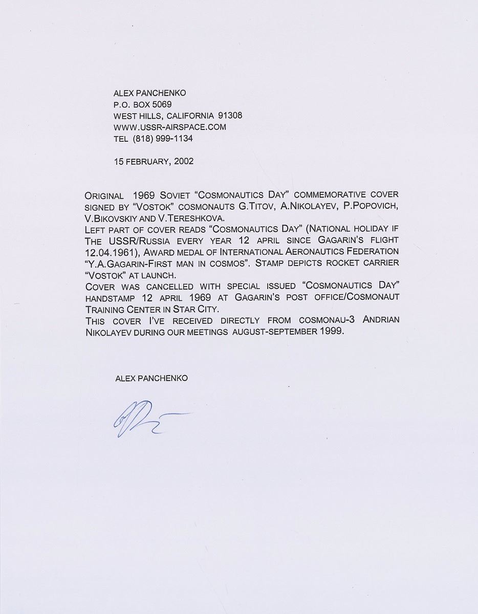 Impressive commemorative cover, 6 x 4.25, with a cachet and stamp honoring Cosmonaut’s Day, a Russian national holiday held on April 12 commemorating the first manned space flight, signed in various ink types by five of the first six cosmonauts, including: Gherman Titov, Andrian Nikolayev, Pavel Popovich, Valery Bykovsky, and Valentina Tereshkova. In fine condition. Accompanied by a letter of provenance from collector Alex Panchenko, in part: “This cover I received directly from cosmonaut–3 Andrian Nikolayev during our meetings August–September 1999.” Panchenko also includes printed images of himself posing with numerous other cosmonaut legends.