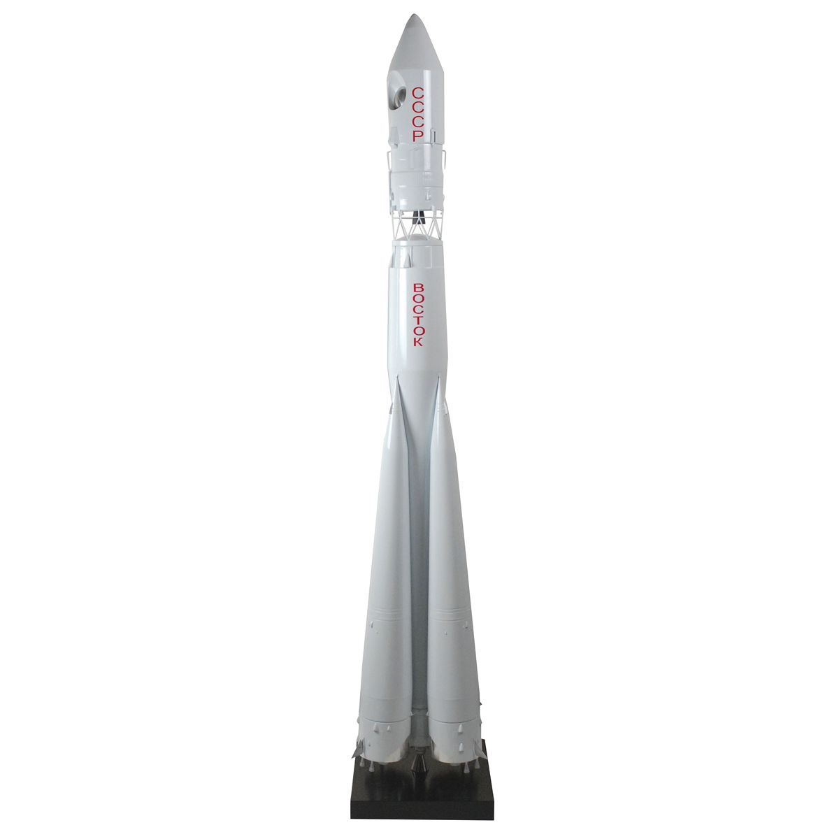 Uncommon and impressive Vostok model rocket. This 1:25 scale model is constructed from glass reinforced plastic, and metal. Made for exhibition purposes by NPO Energia in the 1993, the rocket stands 58? tall and stands on an 11.25 x 11.25 wooden base for an overall height of 62.? In fine condition. Vostok was a family of rockets derived from the Soviet R-7 Semyorka, designed for the human space flight program. The rocket was used to launch the first artificial satellite, Sputnik, and the first man in space Yuri Gagarin. The Vostok series flew six times, with the last mission launching Valentina Tereshkova into orbit in 1963.