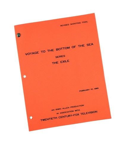 Voyage To The Bottom Of The Sea Exile Production Teleplay - During the height of the Cold War, Irwin Allen, inspired by Russian leader Nikita Khrushchev's visit to Twentieth Century-Fox Studios, and lunch with Frank Sinatra and Marilyn Monroe, and his refusal to attend Disneyland, created a very controversial episode of his hit TV series "Voyage To The bottom Of The Sea" called "the Exile" (Season 1, Episode 27 - first aired March 15, 1965) in which a Khrushchev type leader of Russian wants to defect to the US! This was one of the most watched shows, and even though by the time it aired, Khrushchev was out of office, the State Department got involved with this, worried about the ramifications! The great Ed Asner played the Russian leader "Brynov", and his confident Semenev was played by James Frawley who went on to great fame as the director of "The Monkees" groundbreaking TV series. The episode was directed by the award-winner James Goldstone, and written by legendary writer (and close friend of Marylyn Monroe), William Read Woodfield. This is a truly amazingly mint condition actual production shooting script dated February 10, 1965, of this infamous episode. It is the "rainbow" revised script with the original Twentieth Century-Fox Television front and back cover. A true collector's item!
