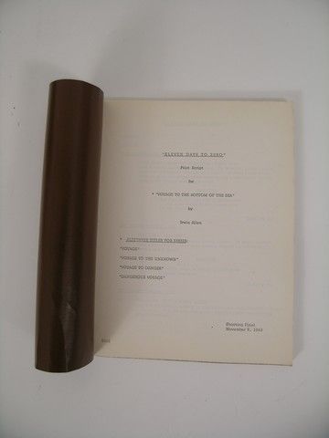 A whole plethora of sci-fi classic shows owe allegiance to master showman Irwin Allen (who also masterminded the disaster movie genre). Adapting his successful futuristic submarine adventure "Voyage to the Bottom of the Sea" in 1961 (borrowed a bit from Jules Verne), he created the now classic series of the same name, which he directed and co-wrote in 1961, he created the TV series three years later. The likes of Gene Roddenberry and George Lucas have said that the film and series greatly inspired them in their own creations. This is a very rare copy of the final shooting script by Irwin Allen (who also directed the episode), for the pilot episode of the series entitled "Eleven Days To Zero" (dated November 8th, 1963). This episode was originally aired on September 14th, 1964, and the rest, of course, is TV sci-fi history!