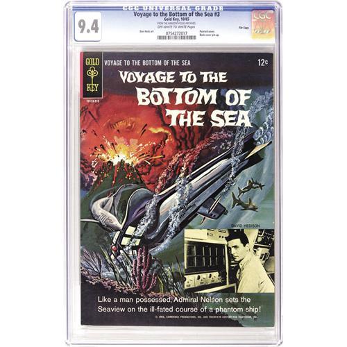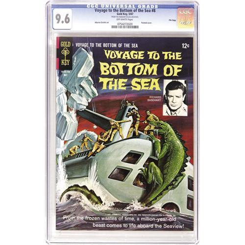 <B>Voyage to the Bottom of the Sea File Copies CGC Group (Gold Key, 1965-69).</B></I> The slabs aplenty here include <B>CGC NM+ 9.6</B></I> copies of #8, 11, and 12; and <B>CGC NM 9.4</B></I> copies of #3, 6, 10, 14, and 15. Overstreet 2006 NM- 9.2 value for group = $470. <I>From the Random House Archives.</B></I> <BR><BR><B>Important notice:</B> Heritage usually auctions material at the rate of 200-250 lots per hour. On some occasions eBay Live bid software or the Internet may not be able to keep up with the pace of the auction. We recommend placing a realistic absentee bid now as insurance to avoid disappointment. Occasionally the auctioneer may eliminate or reject an eBay Live bid, and the auctioneer may also reopen a lot after the close of the eBay live bidding (usually because we missed an audience bid), and may reject your bid even if it shows you as the winning bidder. By bidding via eBay Live, you agree that Heritage may award the lot to another bidder at its sole discretion under the circumstances described above or any other reasonable circumstances. Since eBay bids are not shown to us until we open the lot on the floor, we treat those bids just like floor bids. In most cases the floor responds before the eBay bid is presented to us, due to Internet lag time, so for consistency we have made it a policy that floor bids are always considered first over tie eBay live bids. Also please note that all Heritage lots purchased through eBay Live carry a 22.5% Buyer's Premium. Please make sure you read the Terms and Conditions before you bid. This lot is being auctioned in conjunction with a live floor auction by Heritage Auction Galleries. All final auction and invoice information will be supplied by Heritage Auction Galleries, and all other information should be considered preliminary. Lot:41001 <BR><BR><B>Winning Notification and Billing:</B> After the FINAL session in this auction is complete, Heritage will send e-mail and snail mail invoices. This process normally takes several days. All final auction and invoice information will be supplied by Heritage Auction Galleries, and all other information should be considered preliminary. <BR><BR>This auction will be conducted on a live auction floor and over the Internet through eBay Live. If you choose to place an absentee bid, please take a moment to <font color='#0000ff'><u><a href='http://pages.ebay.com/liveauctions/help/before/laabsentee.html'>learn how eBay Live absentee bidding works</a></u></font><font color='#000000'>