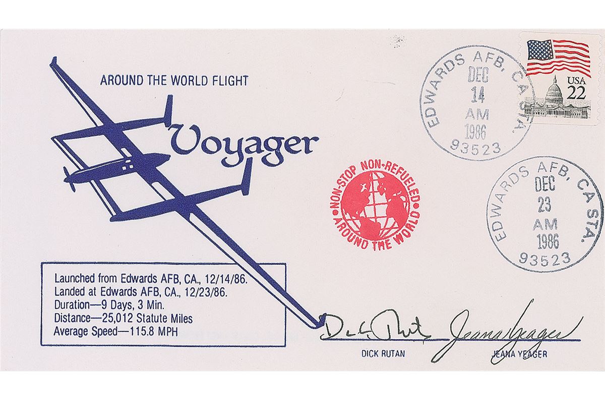 Commemorative cover with a cachet honoring the around-the-world flight of the Voyager, postmarked at Edwards AFB on the launch and return dates, signed in black ink by Dick Rutan and Jeana Yeager. In fine condition. Accompanied by a cardstock presentation sheet with facts about the impressive aircraft.