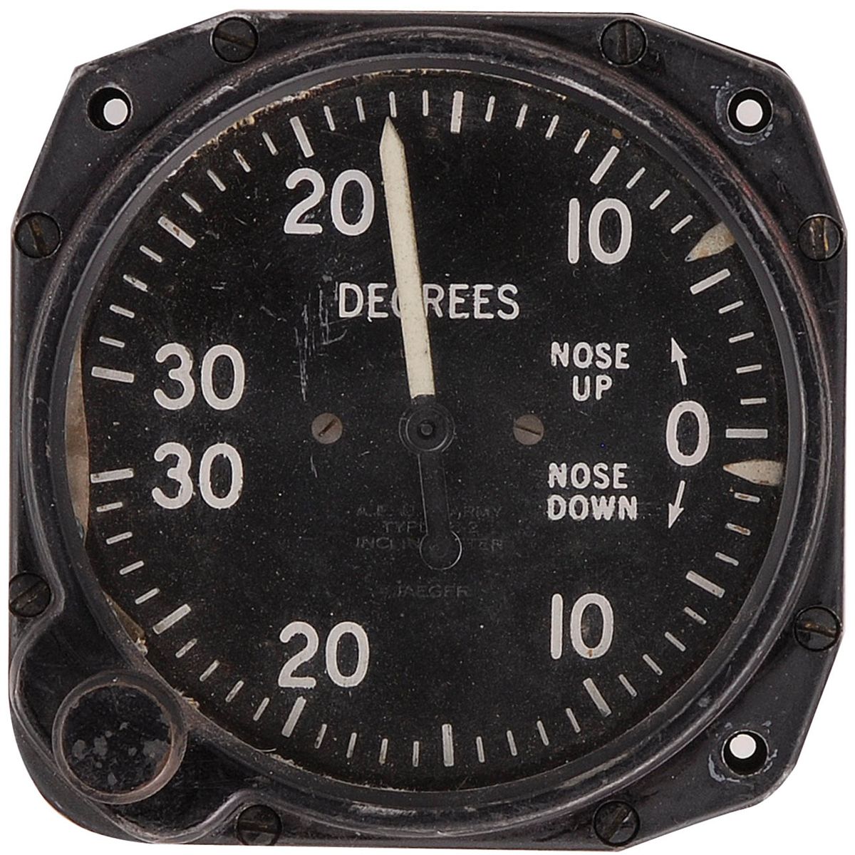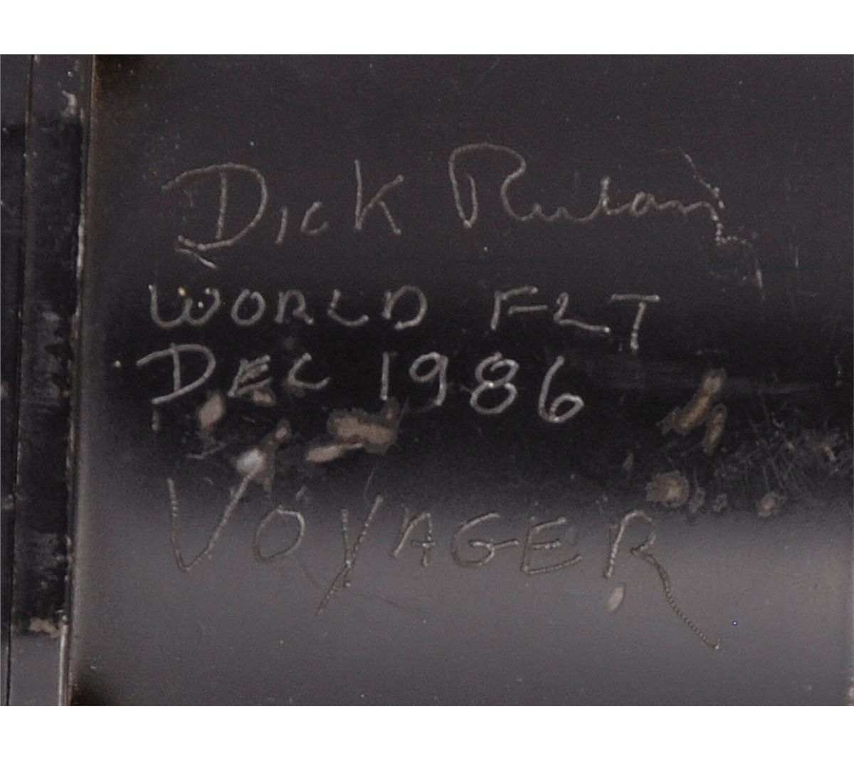 Flown Deck Angle Gauge flown on board the Voyager during testing and its record-setting around the world flight. The deck gauge (Inclinometer) is a three-inch panel mount unit with a 7:30 o’clock resetting knob. Manufactured for the Air Force by Jaeger Watch Company of New York, gauge bears serial number “AF-43-2034.”This gauge was used as an aid in weighing the aircraft in flight to determine the weight of the aircraft, by using the indicated angle-of-attack. Side of the gauge has been signed with an electric engraving pen by Dick Rutan, who engraved “Dick Rutan, World Flt Dec 1986, Voyager.” This gauge actually failed during the flight, making it impossible to calculate the aircraft’s weight.